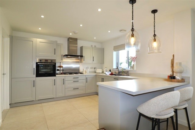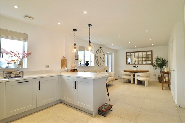 To the rear, you'll find a large, open-plan kitchen and dining area. Featuring stunning stone-effect tiled flooring, the kitchen is fully equipped with integrated appliances. Stylish neutral cabinetry provides fantastic storage throughout, and there's even more convenience with a separate utility room and additional under-stair cupboard. The lovely French doors from the dining area lead out to the private rear garden, ideal for relaxing or entertaining.