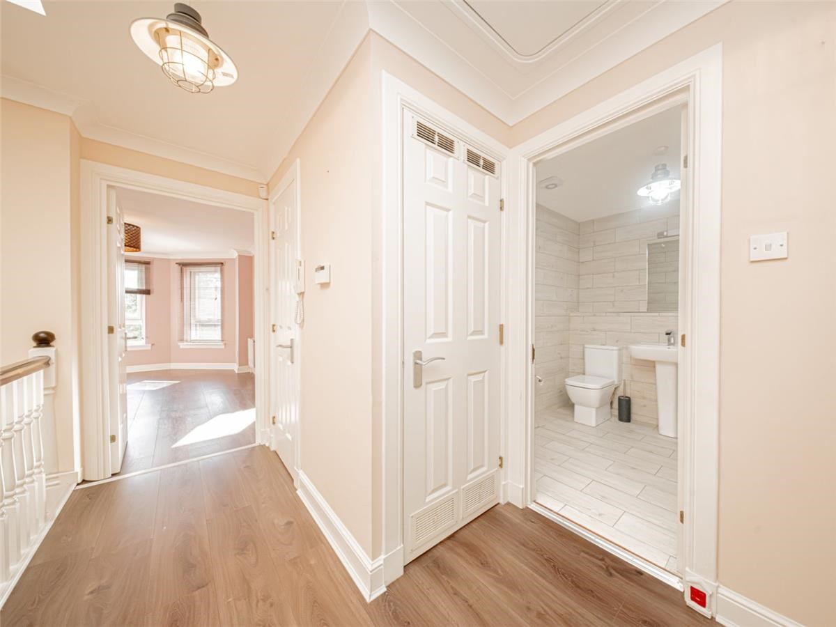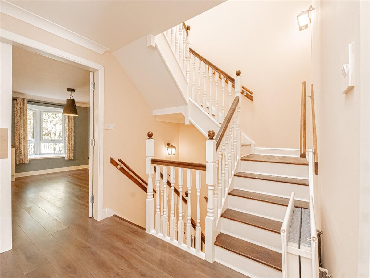 A feature cupola fills the landing with natural light. The principal bedroom suite offers a peaceful retreat with two built-in wardrobes, a dressing area, and a stylish en-suite shower room. Two further double bedrooms, each with built in mirrored wardrobes. A fully tiled family bathroom with bath and overhead double shower completes the top floor.