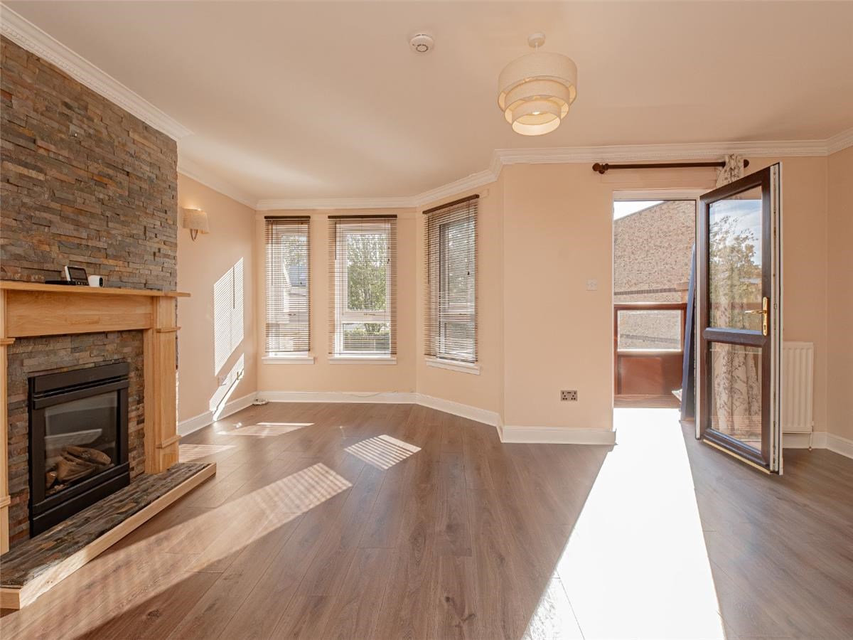 The heart of the home is the spacious, bay-windowed living room featuring a striking slate brick-effect fireplace and door opening onto a private south-facing balcony, perfect for relaxing. The contemporary kitchen and dining area is ideal for family and entertaining, complete with a breakfast island, generous worktop space, and appliances including double ovens, hob, dishwasher, and American-style fridge freezer. A handy WC and storage cupboard complete this level.