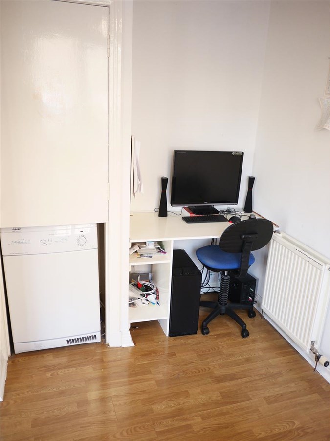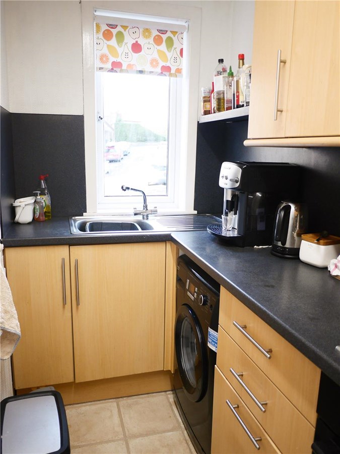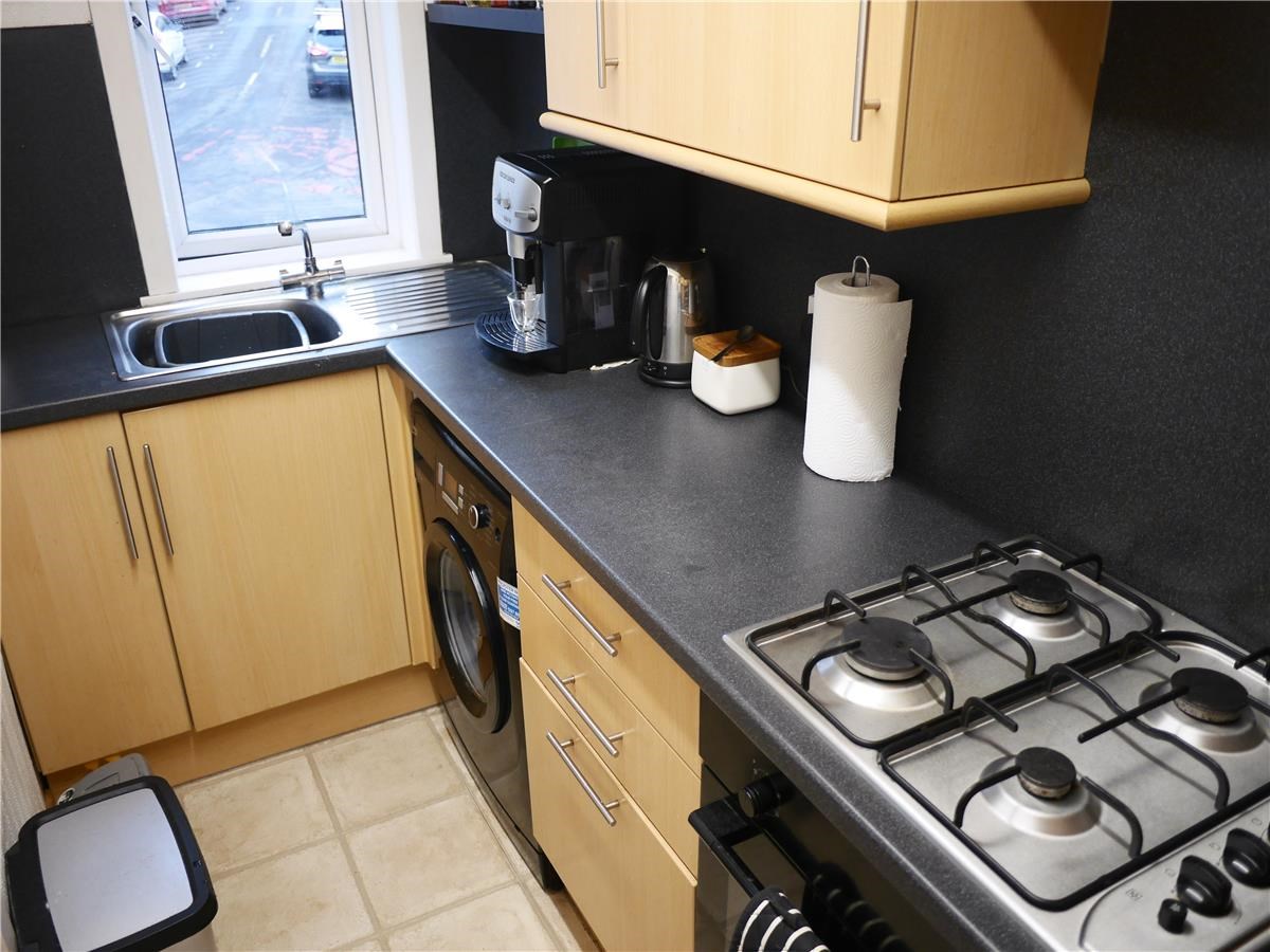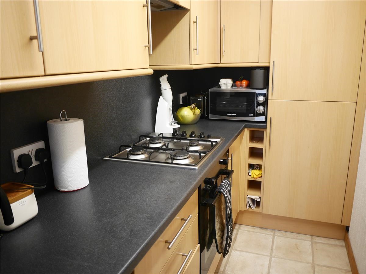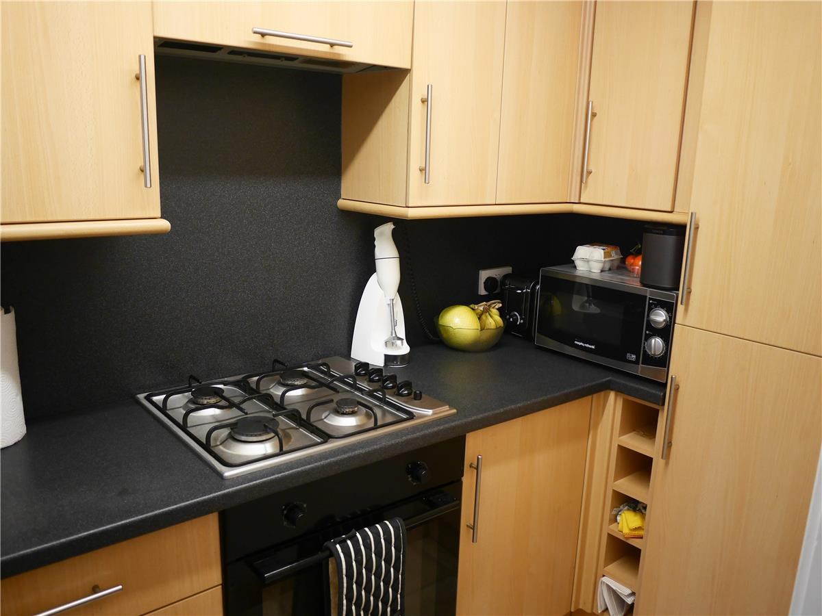 Fully fitted kitchen with gas hob, electric fan oven, microwave and washing machine.