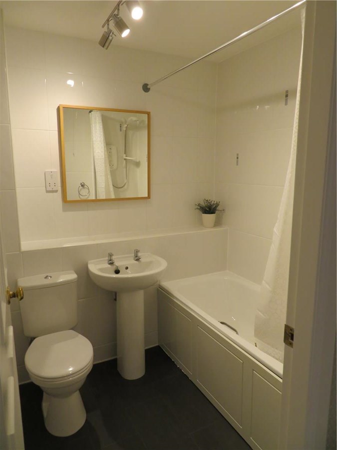 The bathroom is contemporary in style and comprises shower-over-bath, with basin and WC.