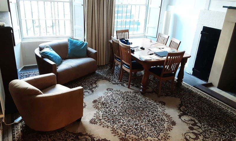 Large living room (6m * 4.5m) with flagged floor and carpet, open fireplace, table to seat 8 or more.