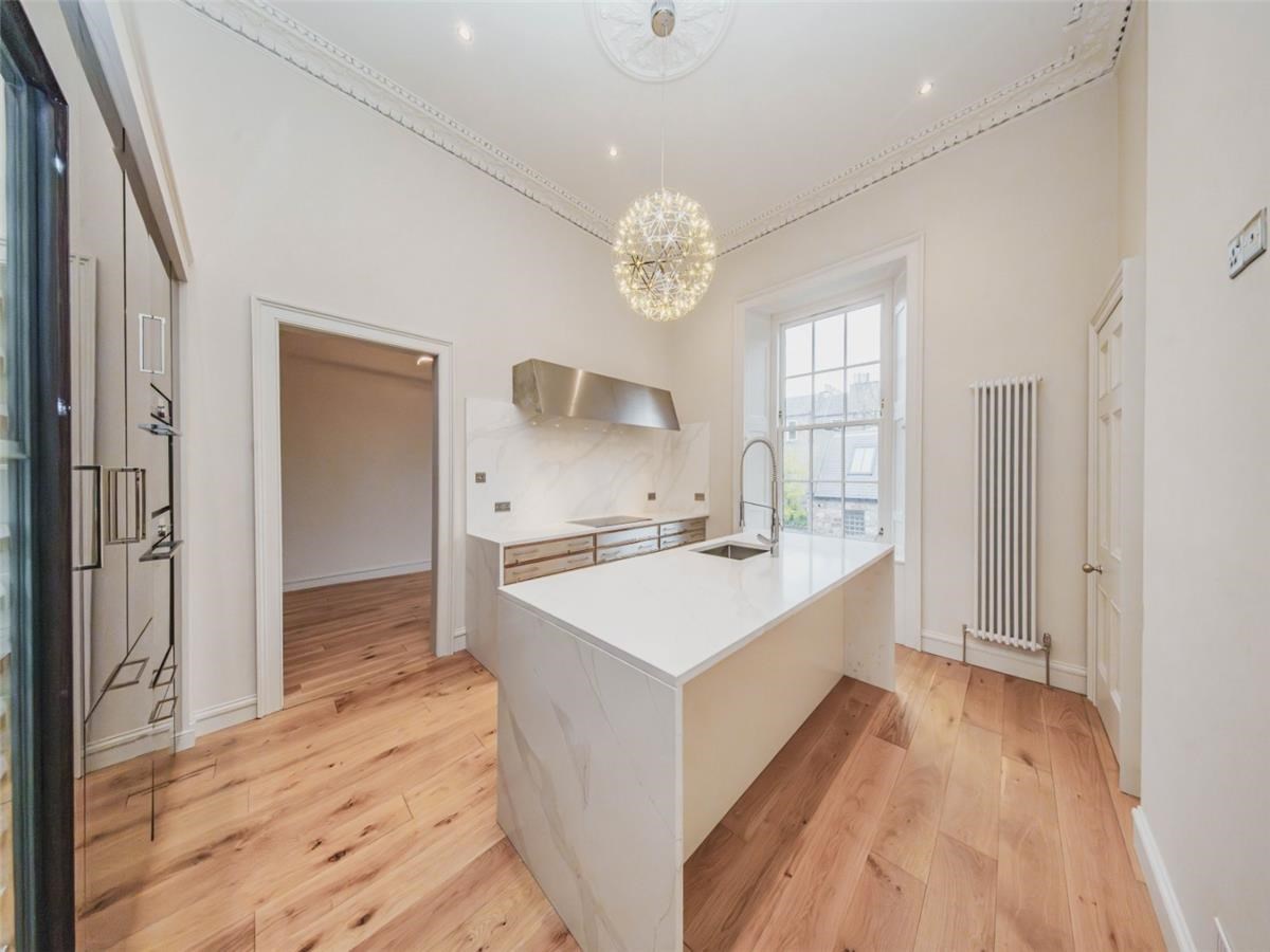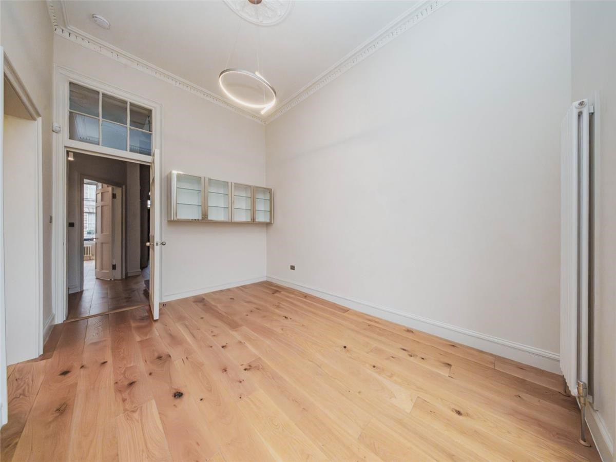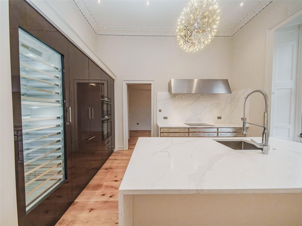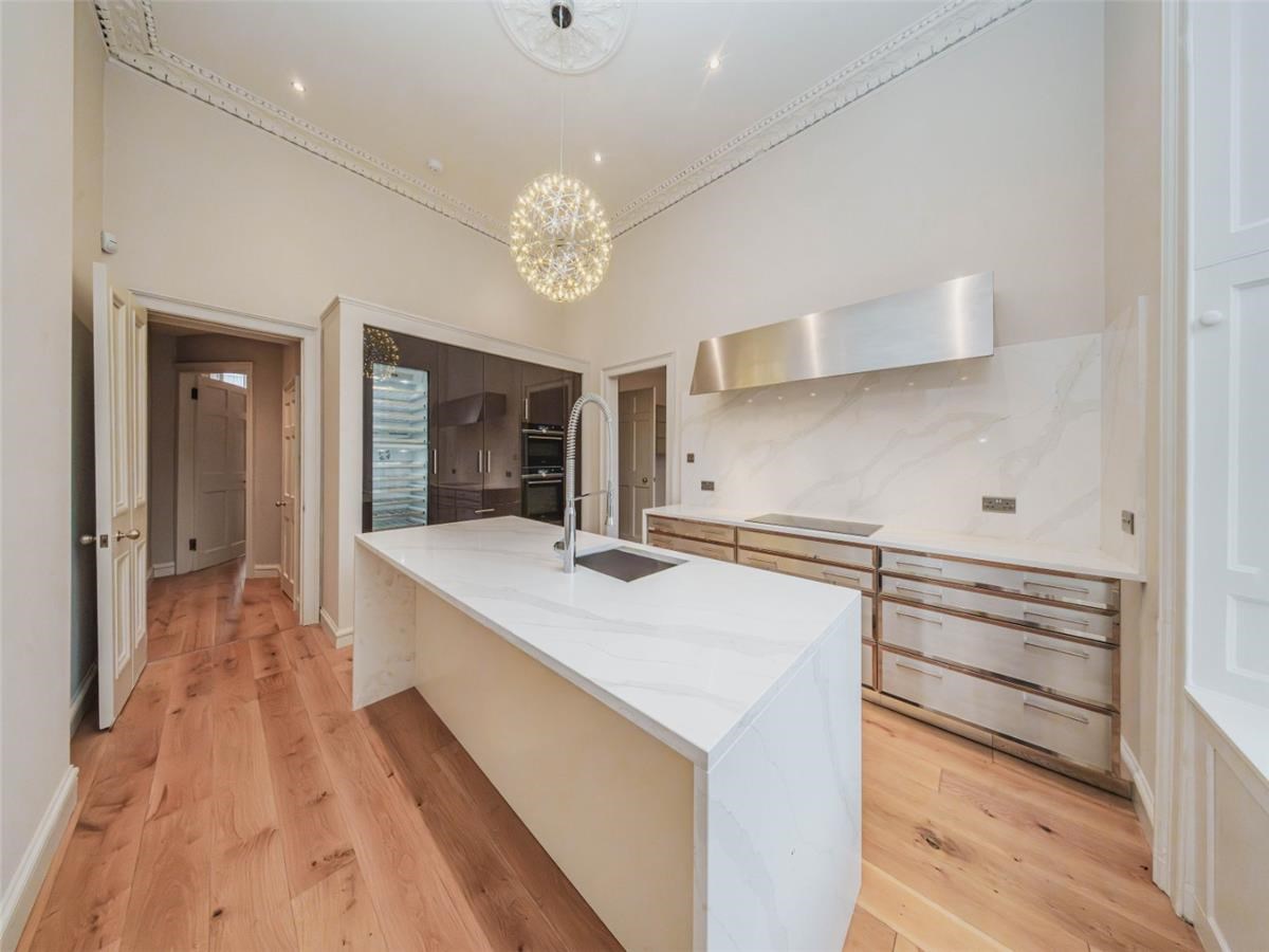 The kitchen opens into the elegant dining room, which features beautiful real wood flooring, original cornicing, and a contemporary light fitting that adds a modern touch to this classic space.