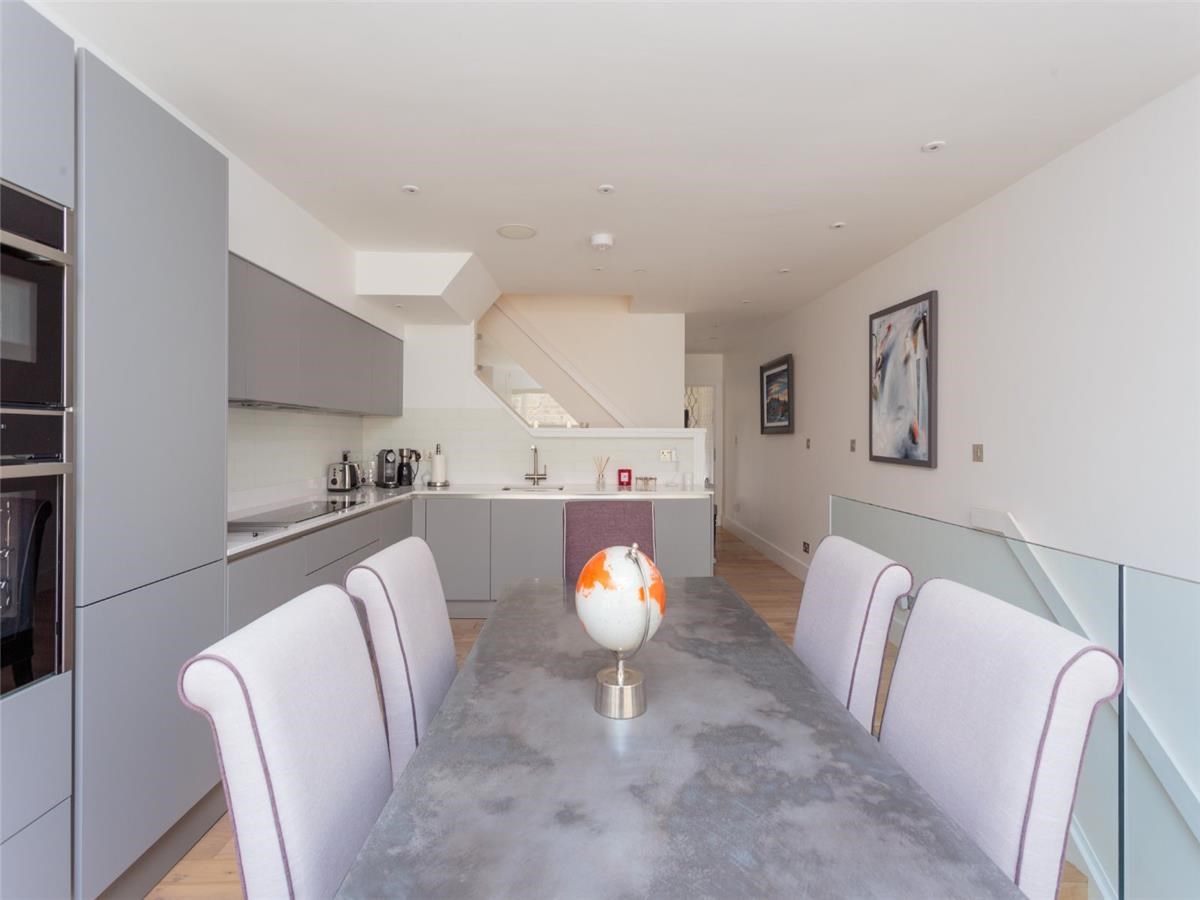 An elegant entrance on the first floor welcomes you with polished wood flooring and recessed lighting, setting the tone for the seamless flow throughout the home. The light-filled kitchen, also on the first floor, is a modern, recently fitted space featuring sleek grey cabinetry, integrated double ovens and dishwasher, and ample storage. It's ideal for hosting, with generous room for a large dining table and chairs.