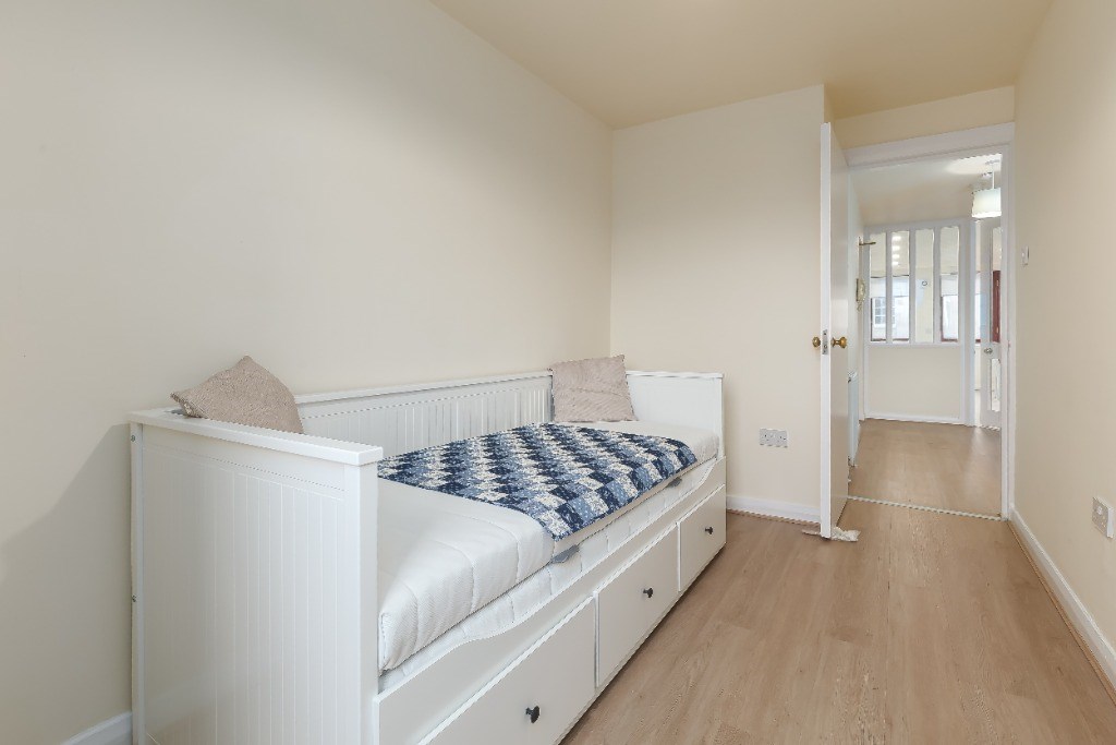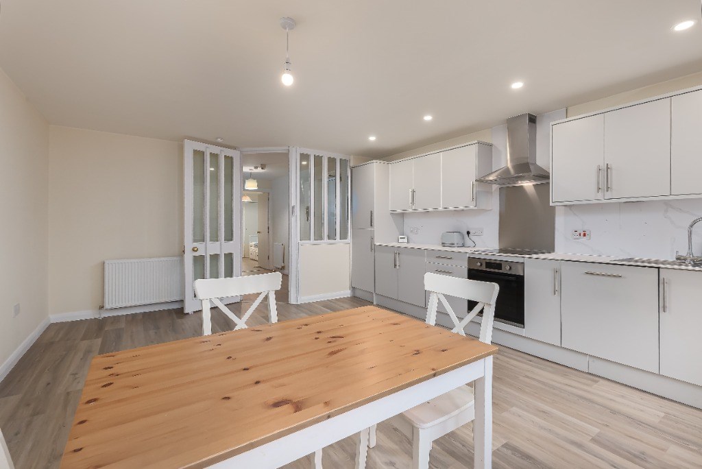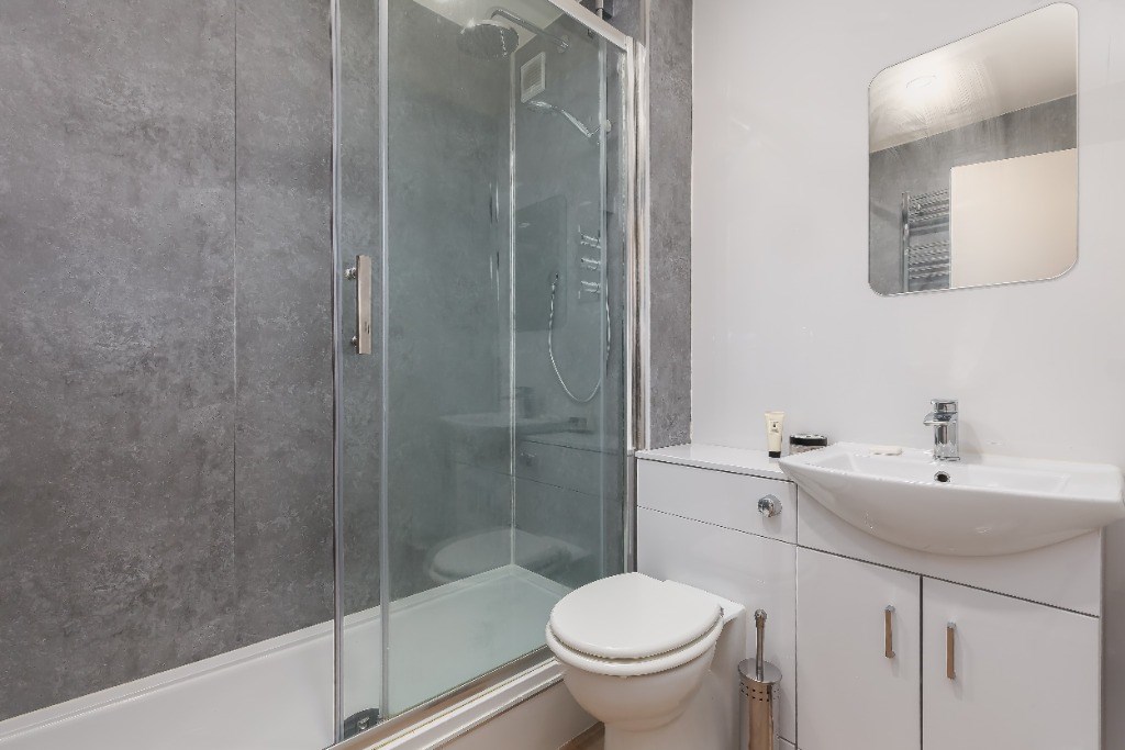 The property offers bright and well-proportioned accommodation, comprising a spacious living room, a contemporary fitted kitchen, and two generous double bedrooms, one of which benefits from a sleek en-suite shower room. A further main bathroom features a shower over the bath.