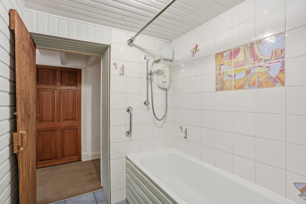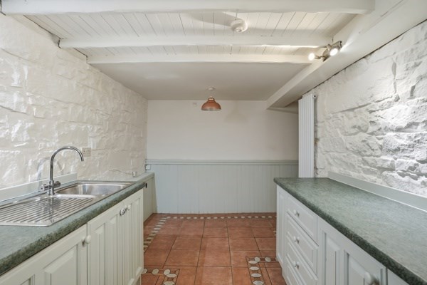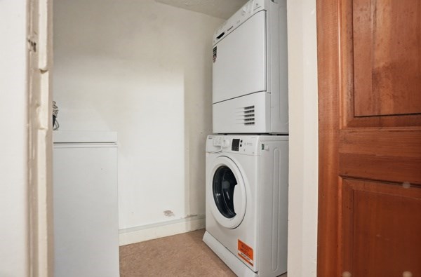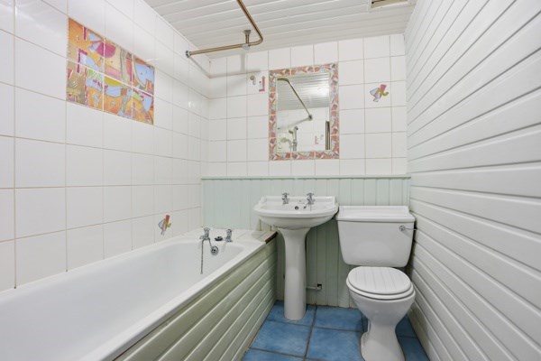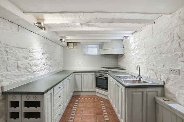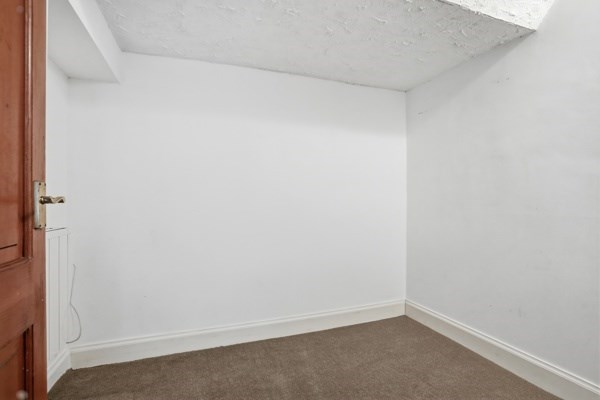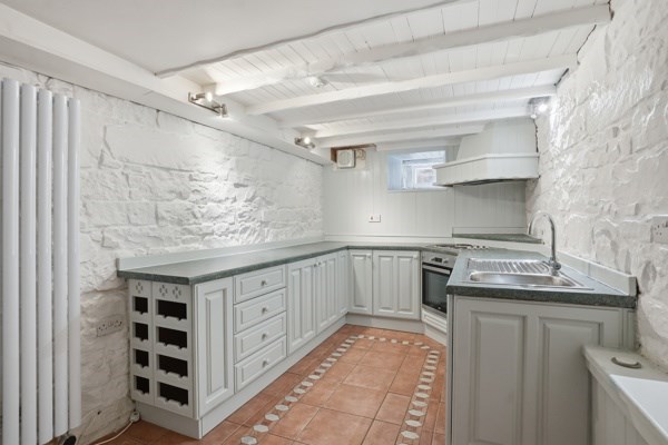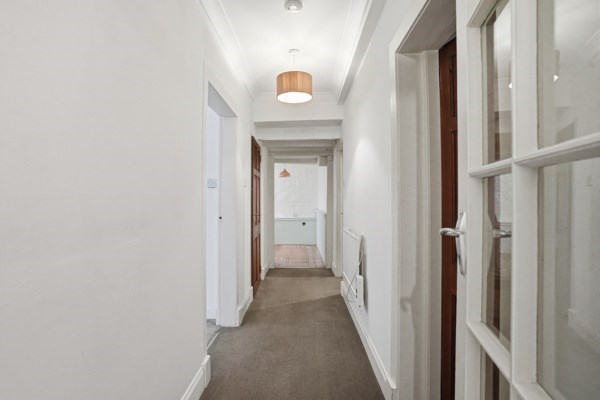 The main door, lower ground property has excellent proportions, the living room is bright with good quality carpet and working shutters, as well as a useful box room that could be used as a home office, a study, or a nursery. The dining kitchen has a rustic finish and is fitted with farmhouse-style cabinetry and a generous workspace with space for a round family dining table. A south-facing window brightens the kitchen, which also includes an integrated electric hob and oven and extractor fan, as well as an integrated fridge with a freezer compartment. The utility cupboard, which is housed in the middle of the hallway, neatly stores a washing machine and a condenser dryer. The master bedroom is a good-sized double bedroom, which looks out onto the front garden area. A traditional sash window with working wooden shutters illuminates the room and incorporates a neat storage space underneath for folded clothes or display items, as well as wall-to-wall built-in wardrobes. The bathroom is furnished with a three-piece suite with a shower over the bath. The bedroom and lounge both have traditional-style sash and case windows.