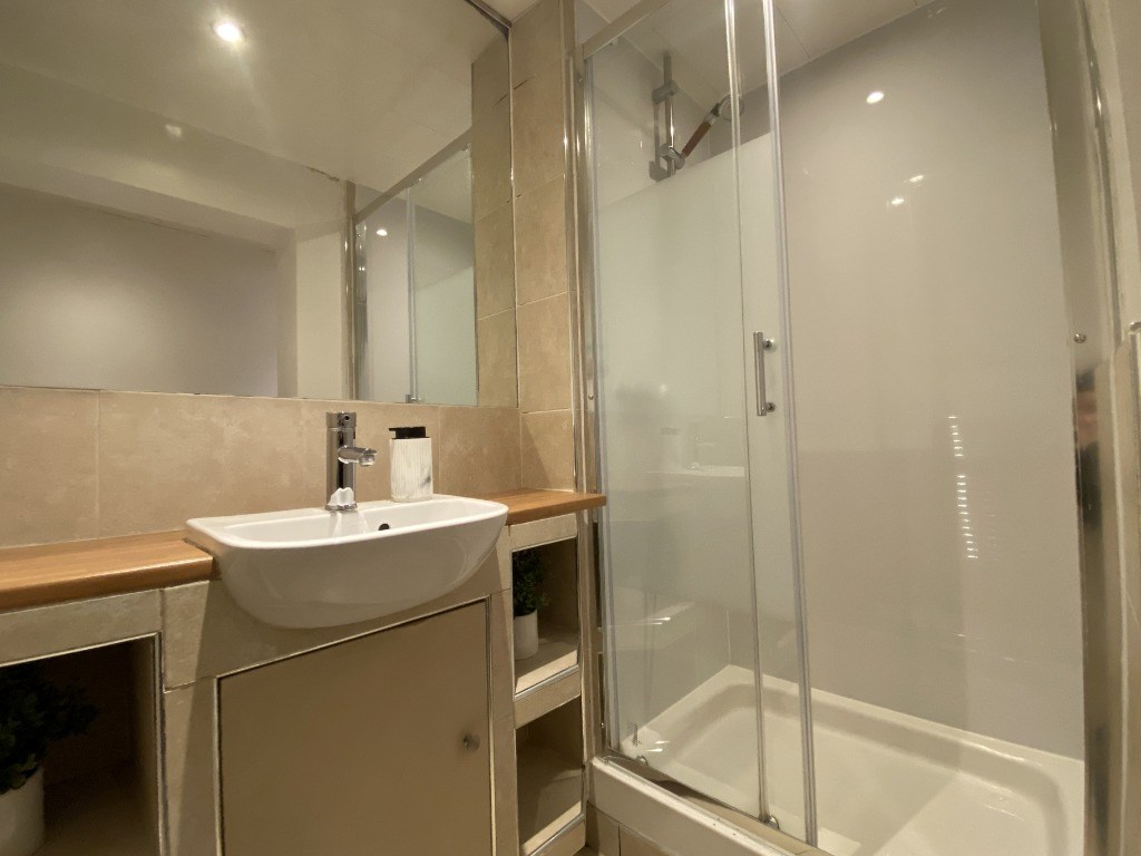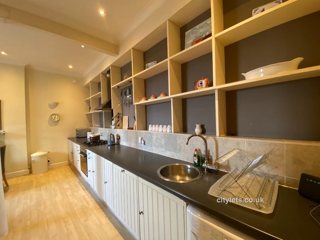 The highlight of this property is the spacious open plan kitchen, living and dining room with views overlooking the city. The room opens out with the kitchen on one side with plenty of cabinet and countertop space. There is open shelving allowing for tenants to add a personal touch to the room. The kitchen is fully equipped with a washing machine, fully sized dishwasher, gas hob and electric oven, kettle, toaster and microwave. There is a four seater dining room table with four dining chairs. There is a L shaped leather sofa and coffee table. There is a large window, allowing plenty of light to come into the room, the window is surrounded by a built in window seat. On either side of the window there is built in book cases and shelving with storage cabinets underneath. The room has large high ceilings and has been freshly painted.