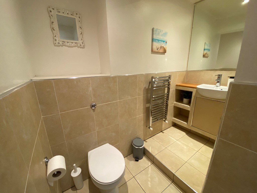 The shower room is partially tiled and comes equipped with a toilet, heated towel rail, sink with shelving and spacious shower cubicle. There is a mirror above the sink and the shower cubicle has wet walls making it easy to clean and maintain.