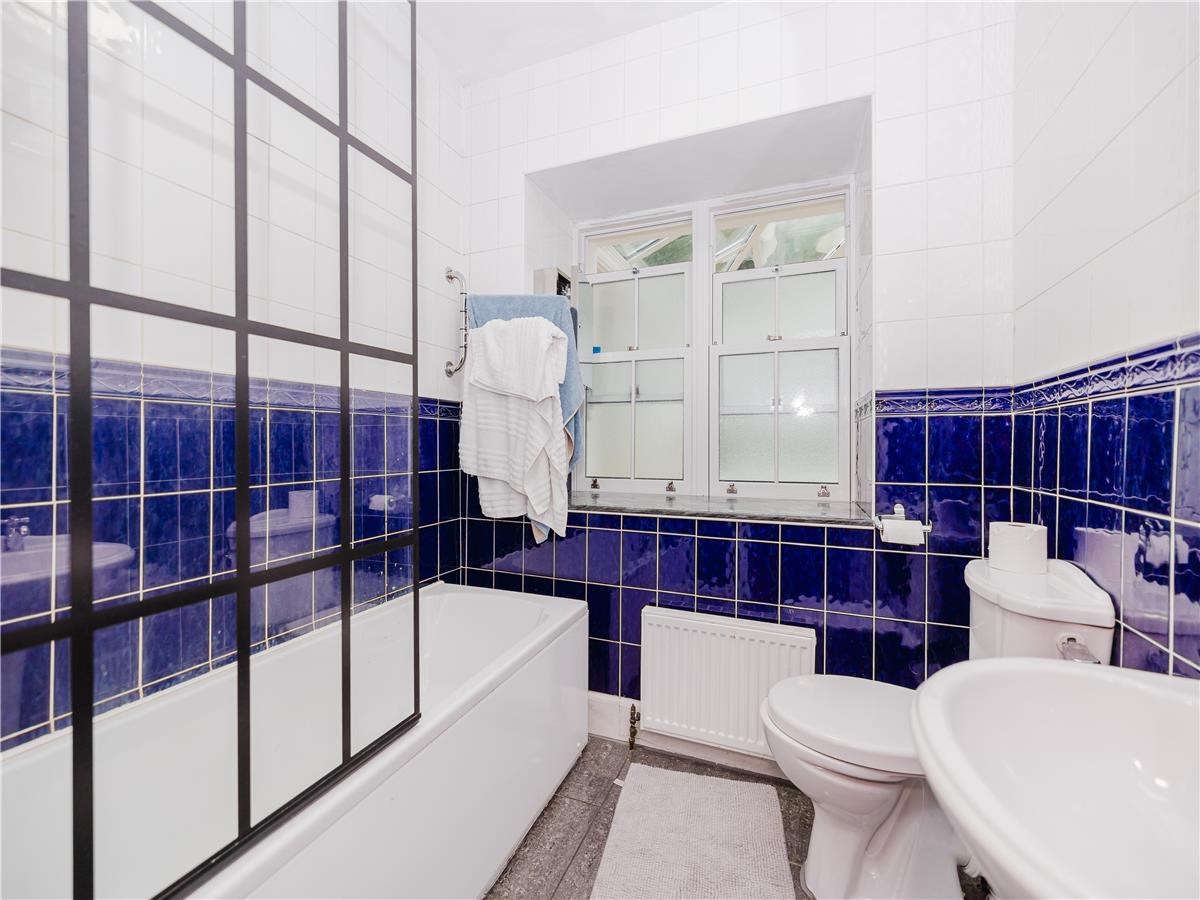 ~Attractive bathroom with tiled splashback and three-piece suite, including shower over bath