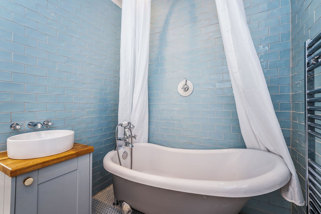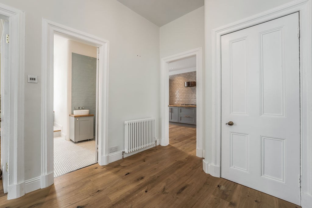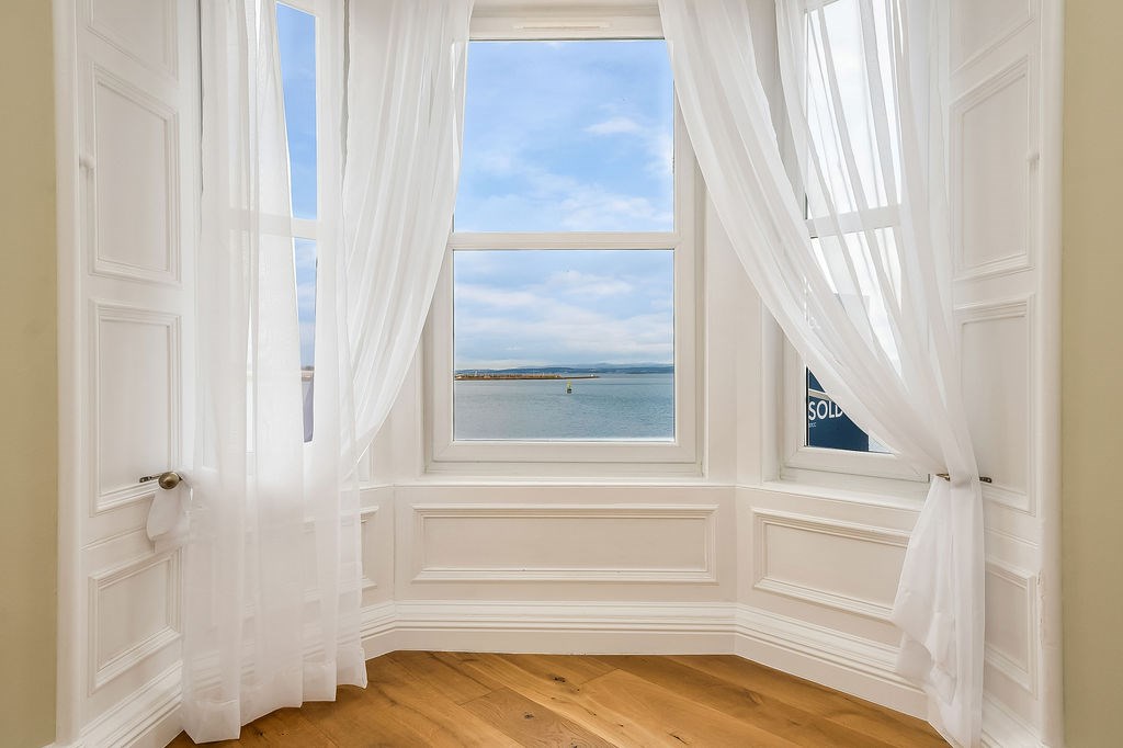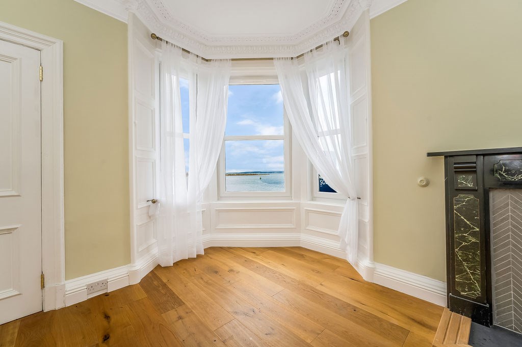 The accommodation comprises of; an entrance hallway with excellent storage, spacious kitchen with connecting study/box room and substantial open living room with ocean views. The two generous double bedrooms are quietly positioned to the side of the property, both are carpeted and the larger of the two has a built-in corner wardrobe. A well-designed, three-piece family bathroom completes the accommodation and features a luxurious roll top, freestanding bath with overhead shower. The property benefits from a well maintained communal garden, a shared bike shed and on-street residents parking.