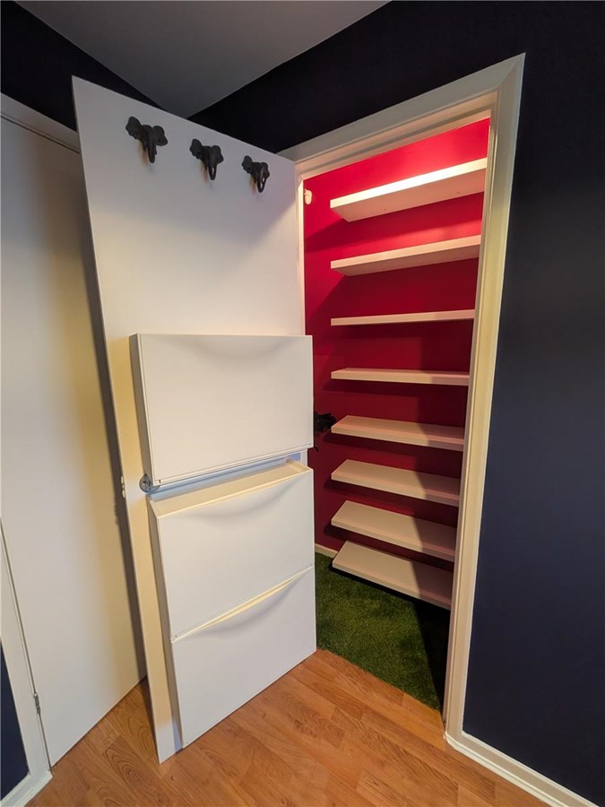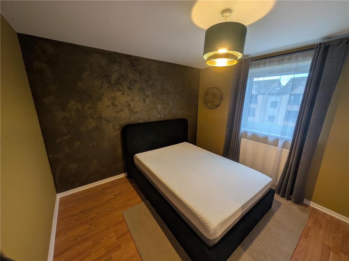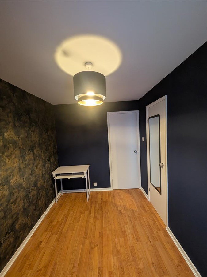 Second bedroom with feature wallpaper, small wardrobe and desk — ideal for working from home