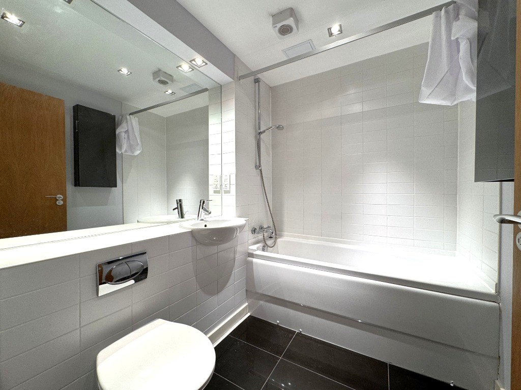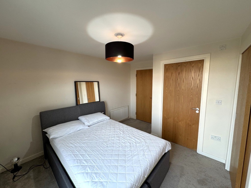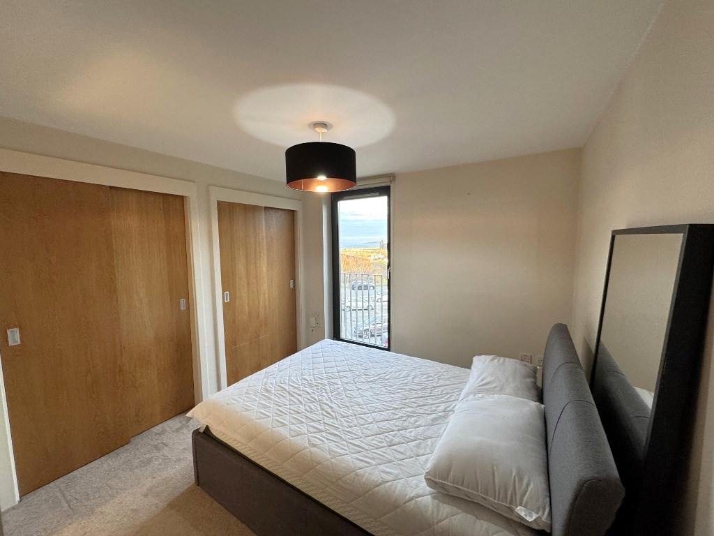 The master bedroom includes a built-in wardrobe, double bed, and stunning views across the Firth of Forth, complemented by a contemporary en-suite. A second versatile bedroom connects via a Jack and Jill layout to the main living area and is furnished with a desk, chair, and futon, making it ideal for guests or home working. The property also benefits from a modern family bathroom with a three-piece suite and shower over the bath.