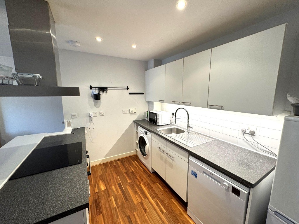 Inside, the property features a bright and spacious open-plan living area, where French doors open onto a charming Juliet balcony, filling the space with natural light and offering a pleasant outlook. The modern kitchen is fitted with high-end units and a breakfast bar with seating, alongside integrated appliances including a fridge/freezer, oven and hob, washing machine, microwave, and dishwasher.