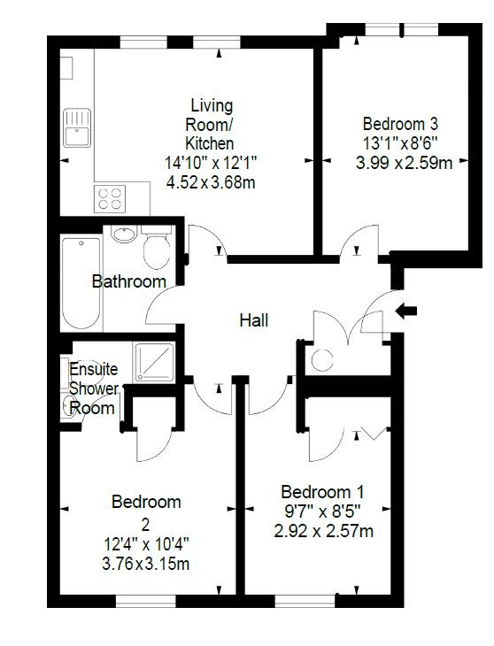Property comprises of living room/fully fitted kitchen, three double bedrooms (one with ensuite shower room) and main bathroom with electric shower over bath.