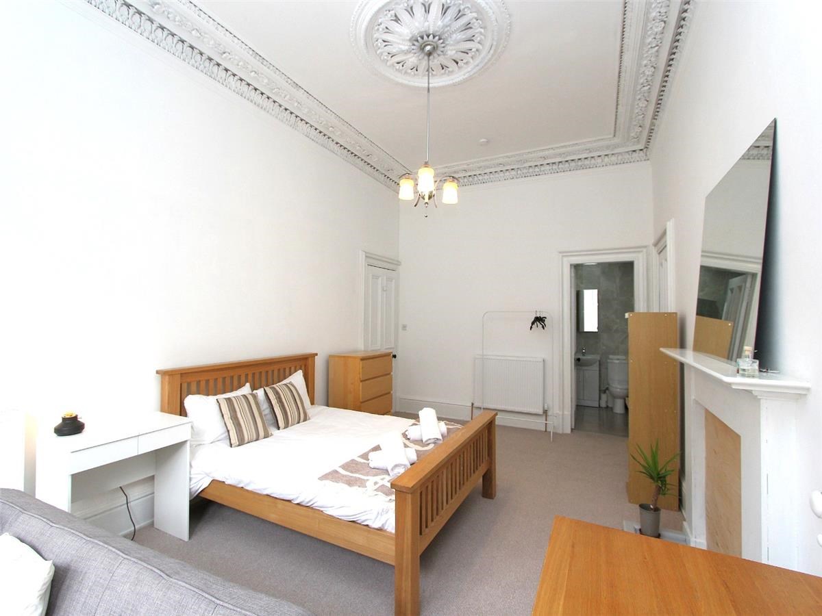 The accommodation comprises three generous double bedrooms, offering plenty of space for both rest and study, a bright open-plan living/kitchen area, a stylish family bathroom, and a second en-suite modern bathroom. There is a bright and welcoming living area is ideal for relaxing or socialising and leads through to a fully fitted kitchen complete with all essential appliances. High ornate ceilings, large windows, and elegant period features enhance the sense of space and light throughout.