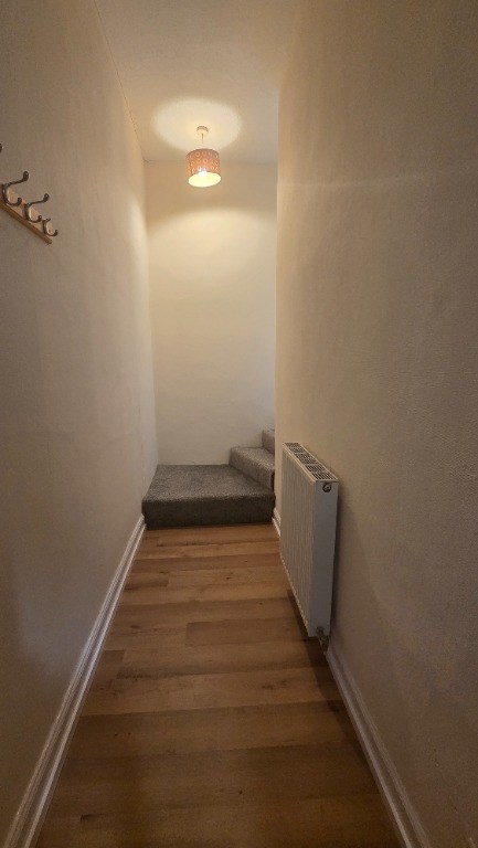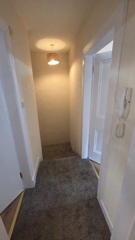 The L-shaped entrance hallway with storage cupboard off rises up several stairs to access an open plan lounge/kitchen, compact double bedroom and shower room with WC.