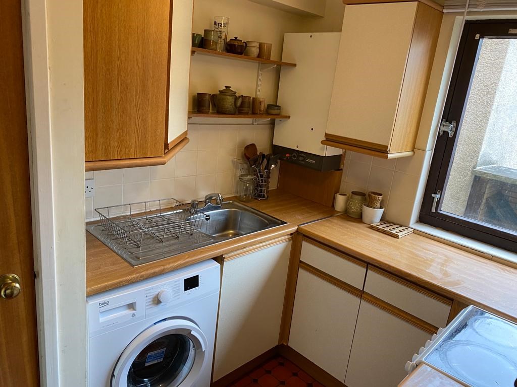 The separate kitchen with lino flooring and well equipped appliances including electric hob and oven, washing machine, undercounter fridge and microwave. There is also a large tall cupboard which has shelving for extra storage.