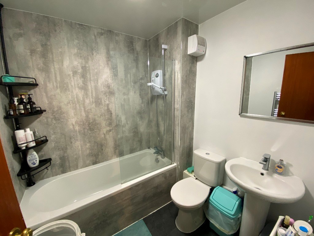 The modern bathroom has an electric shower over bath, sink, a mirror and toilet. The area around the shower/bath has wet walls making it easy to clean and maintain, there is also a heated towel rail.