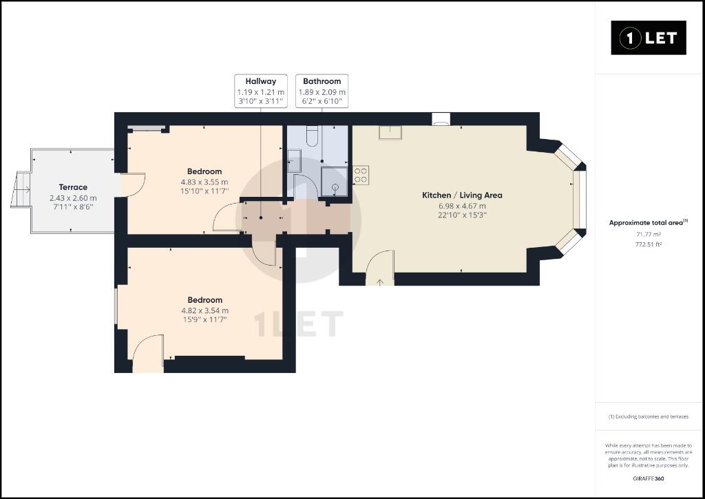 The property boasts two very well proportioned bedrooms, one with direct access to private patio and then shared back garden. Modern bathroom with large shower cubical as well as spacious open plan kitchen livingroom with dining area.