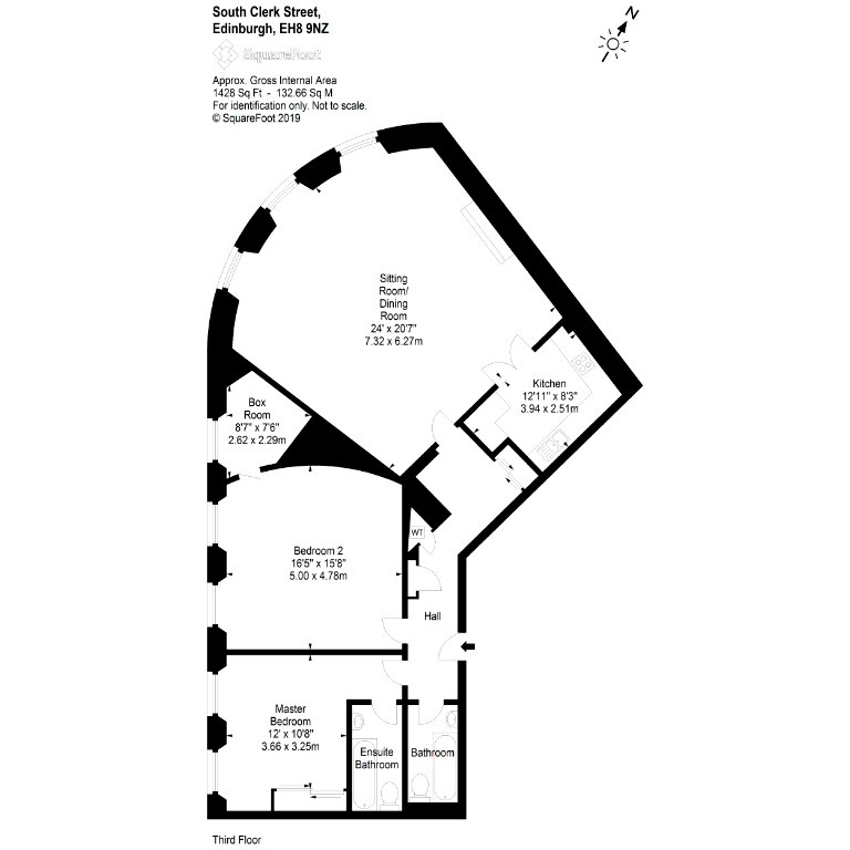 A long hall leads to massive living room, which is flooded with natural light from the three sash and case windows located on the curved crescent wall. Just off the living room is a modern fully fitted kitchen with all white goods. The property boasts two very well proportioned bedrooms, one with a large office/study/store room and two bathrooms, both with baths and showers over.