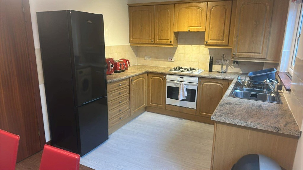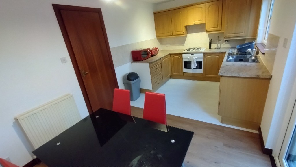 The lower floor of this property consists of a spacious lounge with sofa, chairs and coffee table in place. There will be space for a TV and additional units that you would be looking to have in place in a lounge. A kitchen with dining area and French doors leading to the private garden. The kitchen is fully furnished and has ample storage space above and below the work tops. A gas hob and electric oven is also fitted in the kitchen area. To complete the lower floor, there is a WC just beside the front door.