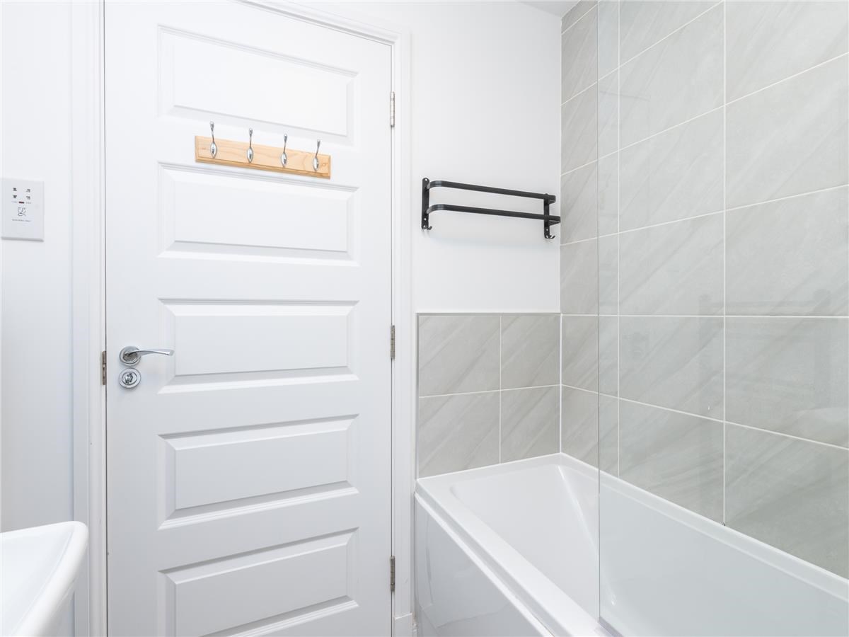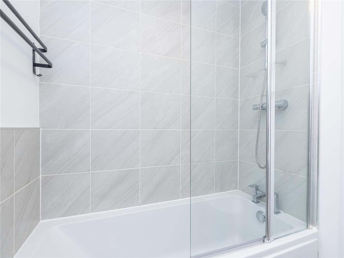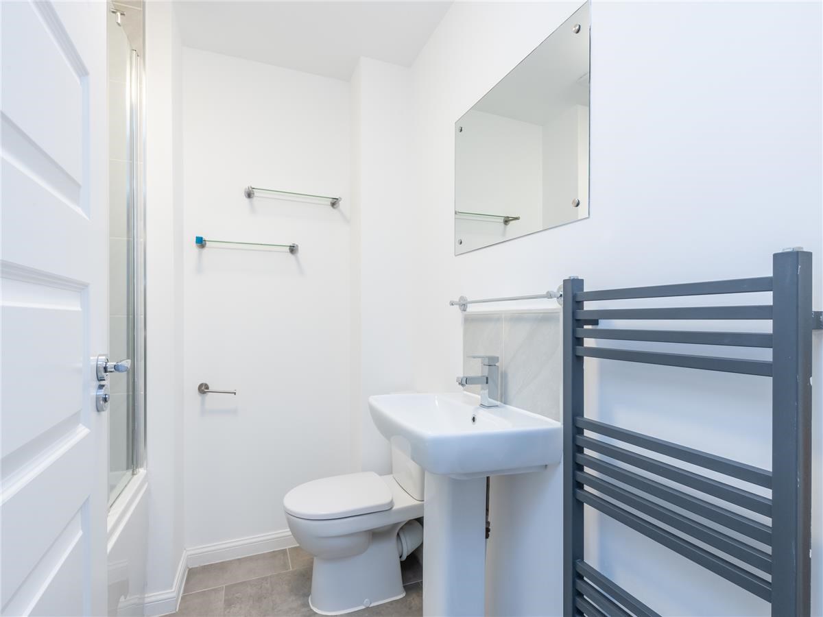 ~ Bathroom: Contemporary three-piece bathroom with shower-over-bath, WC, and wash hand basin.