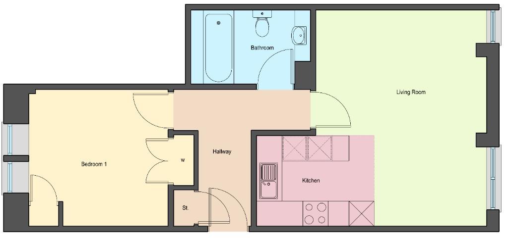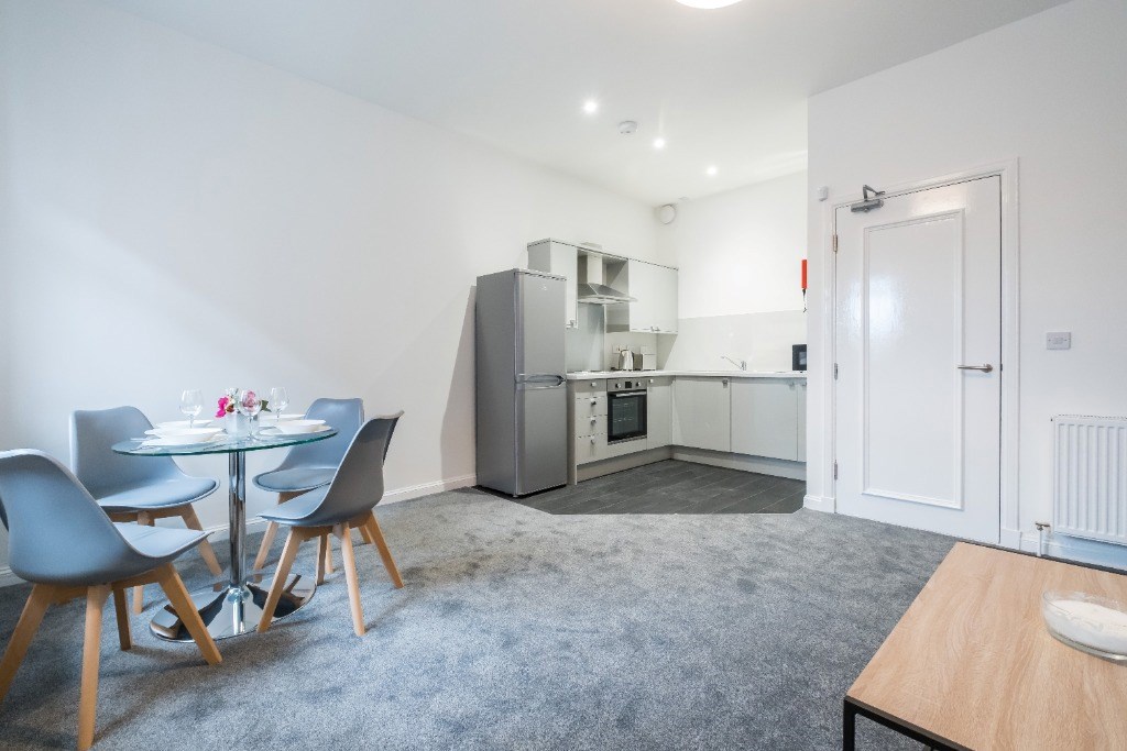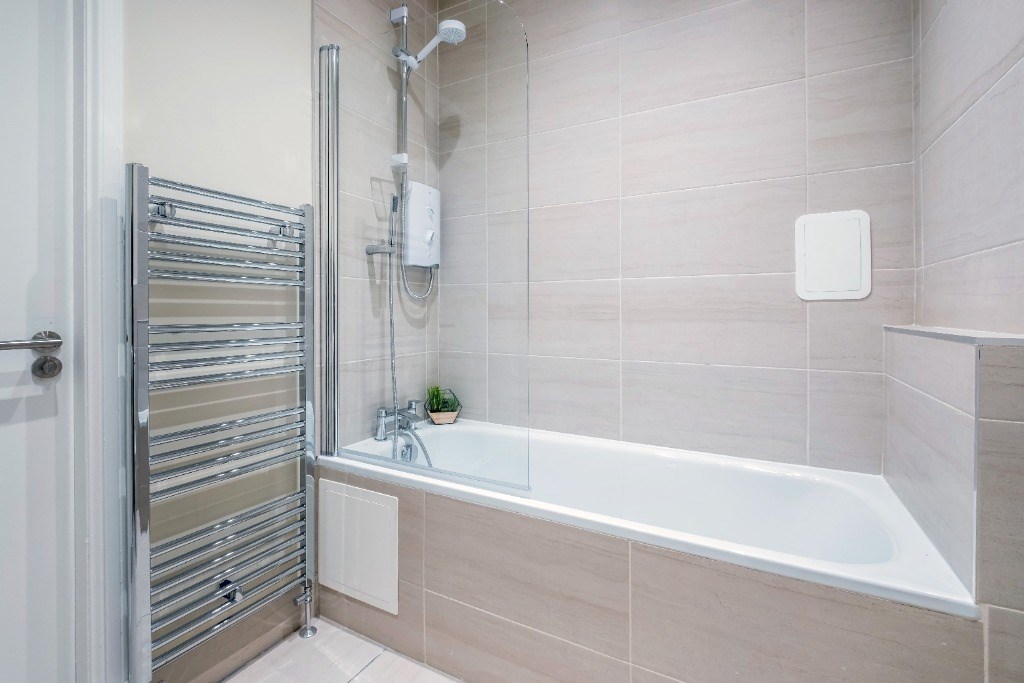 To your right lies the modern open plan kitchen/living room area, with retained original features, perfect for entertaining or unwinding. The kitchen is fitted with modern appliances and granite effect worktops. To the left is the tiled fitted bathroom with shower over bath.