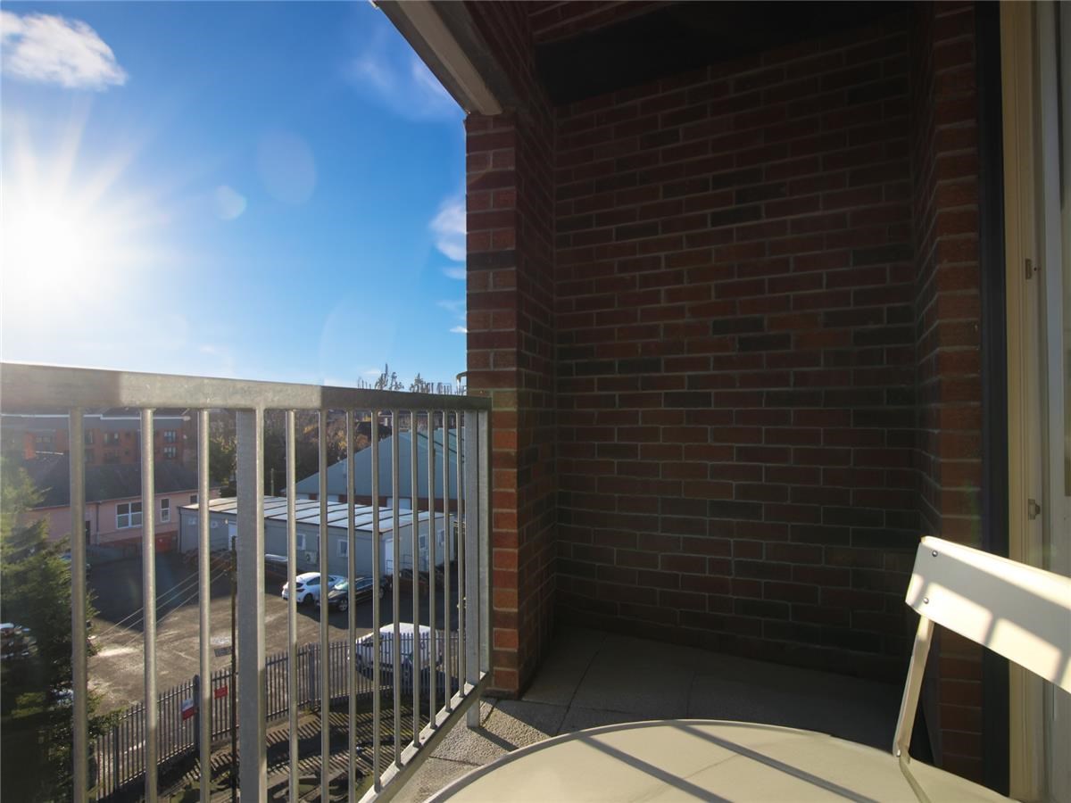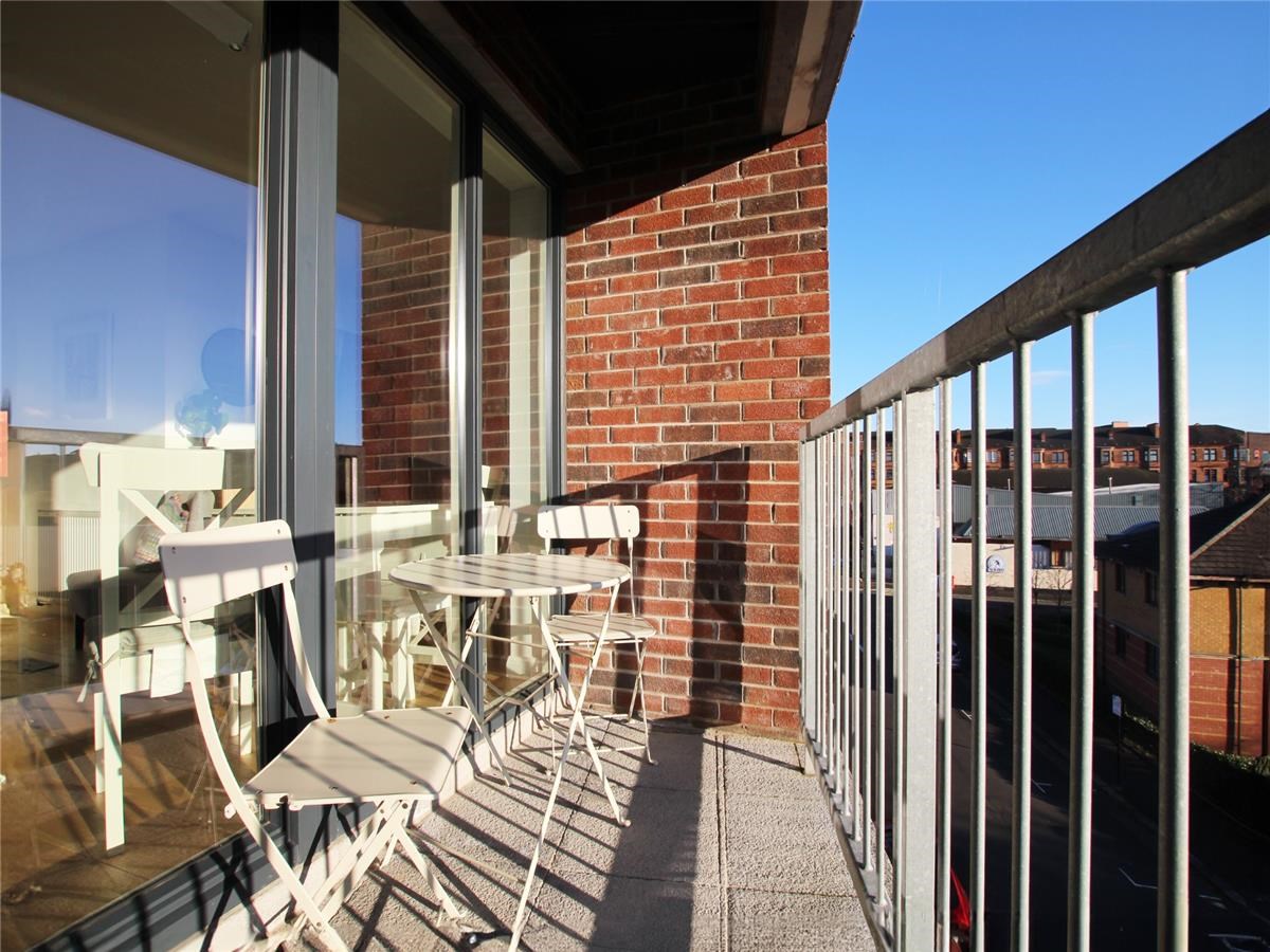 The main open-plan living area presents a bright and inviting atmosphere, with access to a private balcony that extends the living space and provides stunning views of Glasgow’s West End.