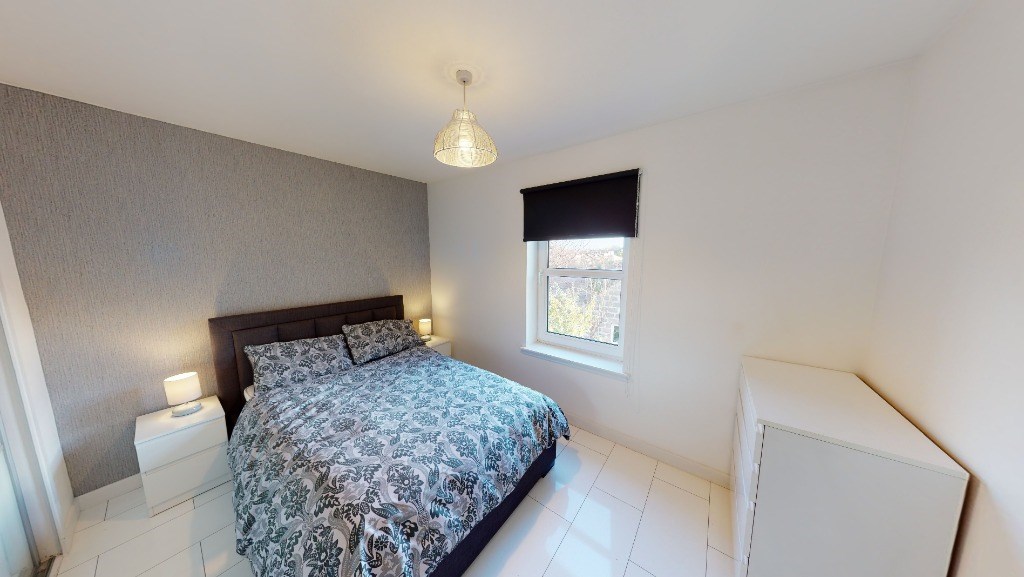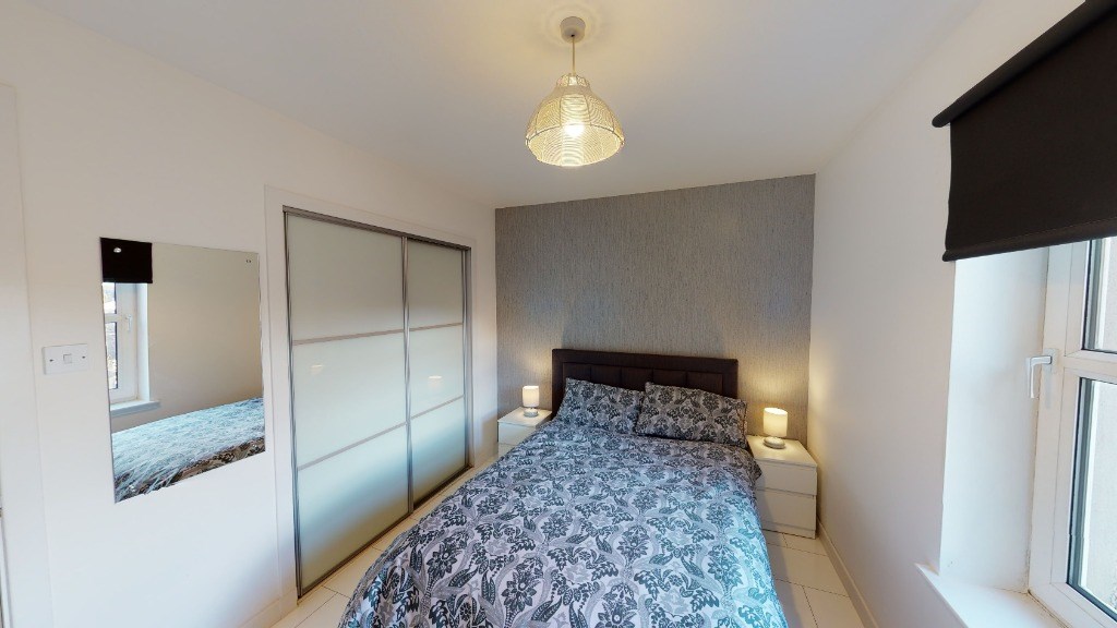 Bedroom with double bed and walk in wardrobe spanning 1 wall