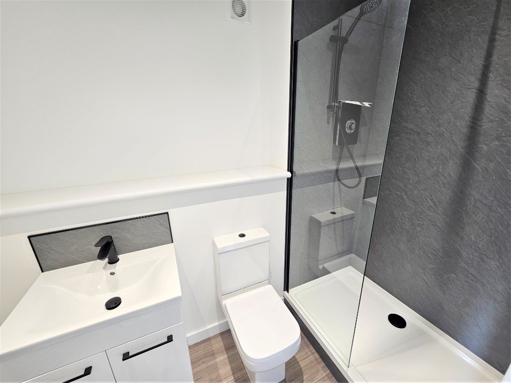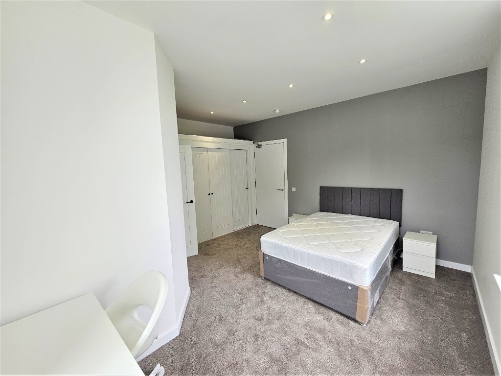 Double bedroom with built in storage and en-suite shower room: Communal kitchen/ living room with breakfast bar, dishwasher, fridge freezer: Utility room with washing machines