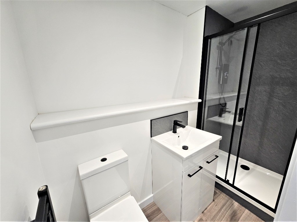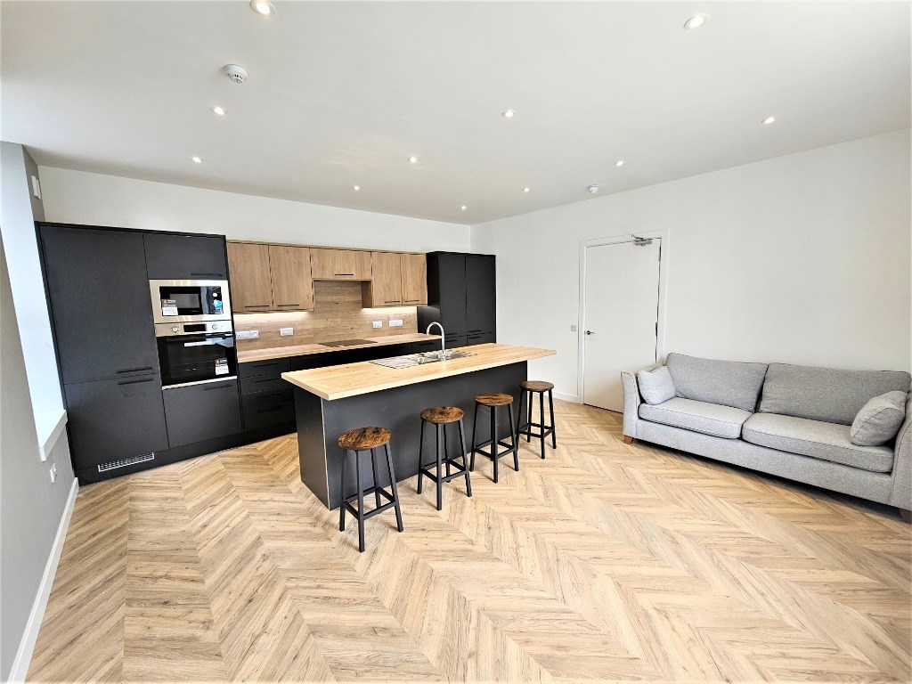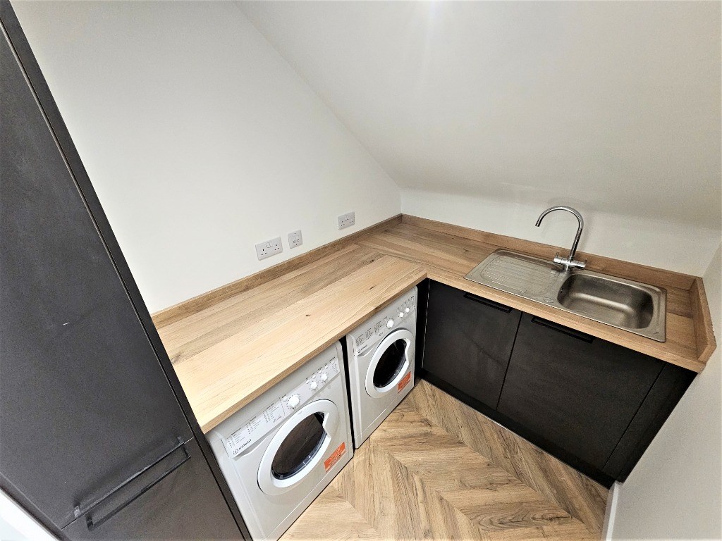 Double bedroom with built in storage and en-suite shower room: Communal kitchen/ living room with breakfast bar, dishwasher, fridge freezer: Utility room with washing machines