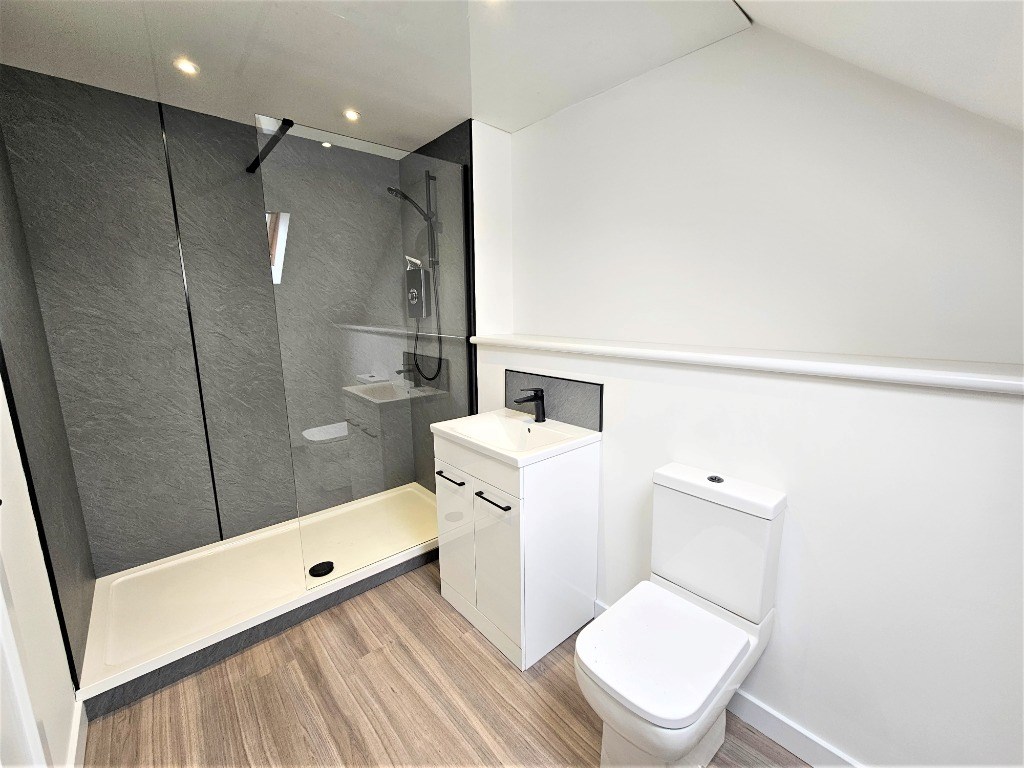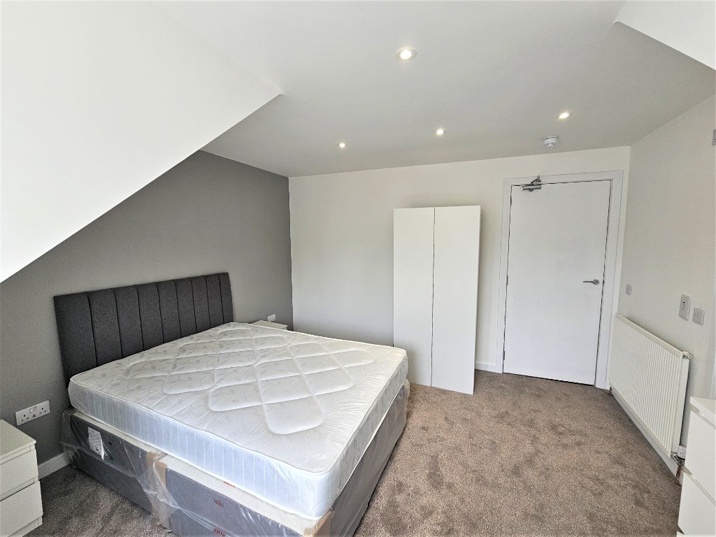 Double bedroom with built in storage and en-suite shower room: Communal kitchen/ living room with breakfast bar, dishwasher, fridge freezer: Utility room with washing machines