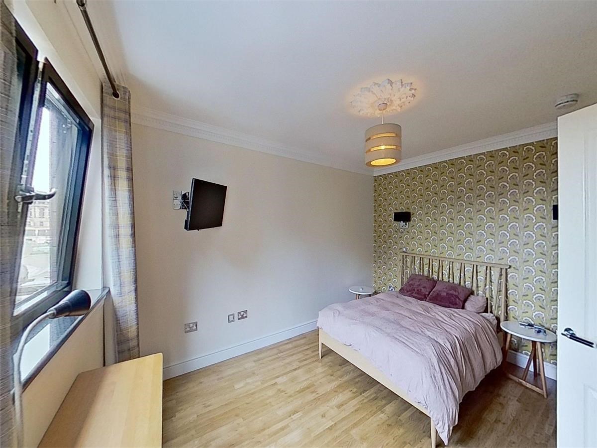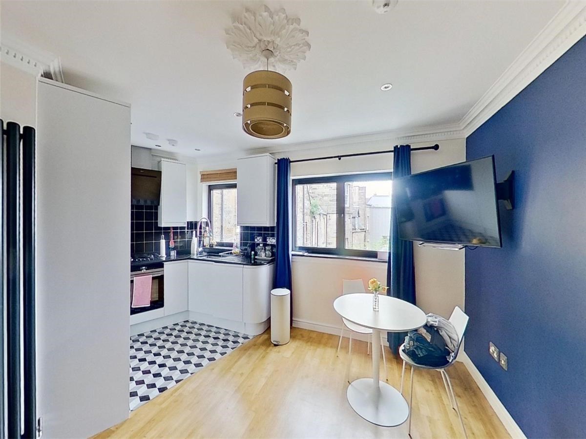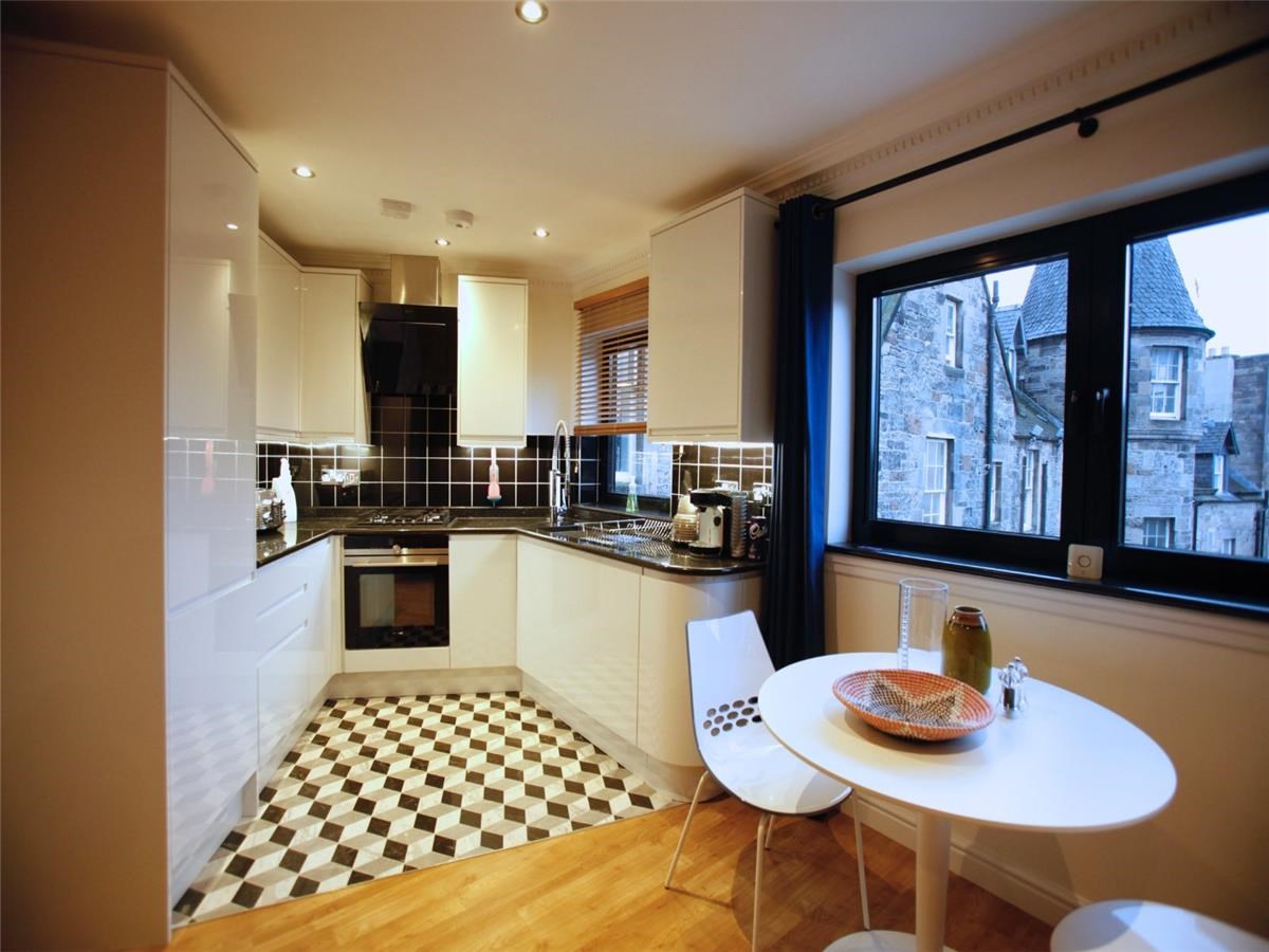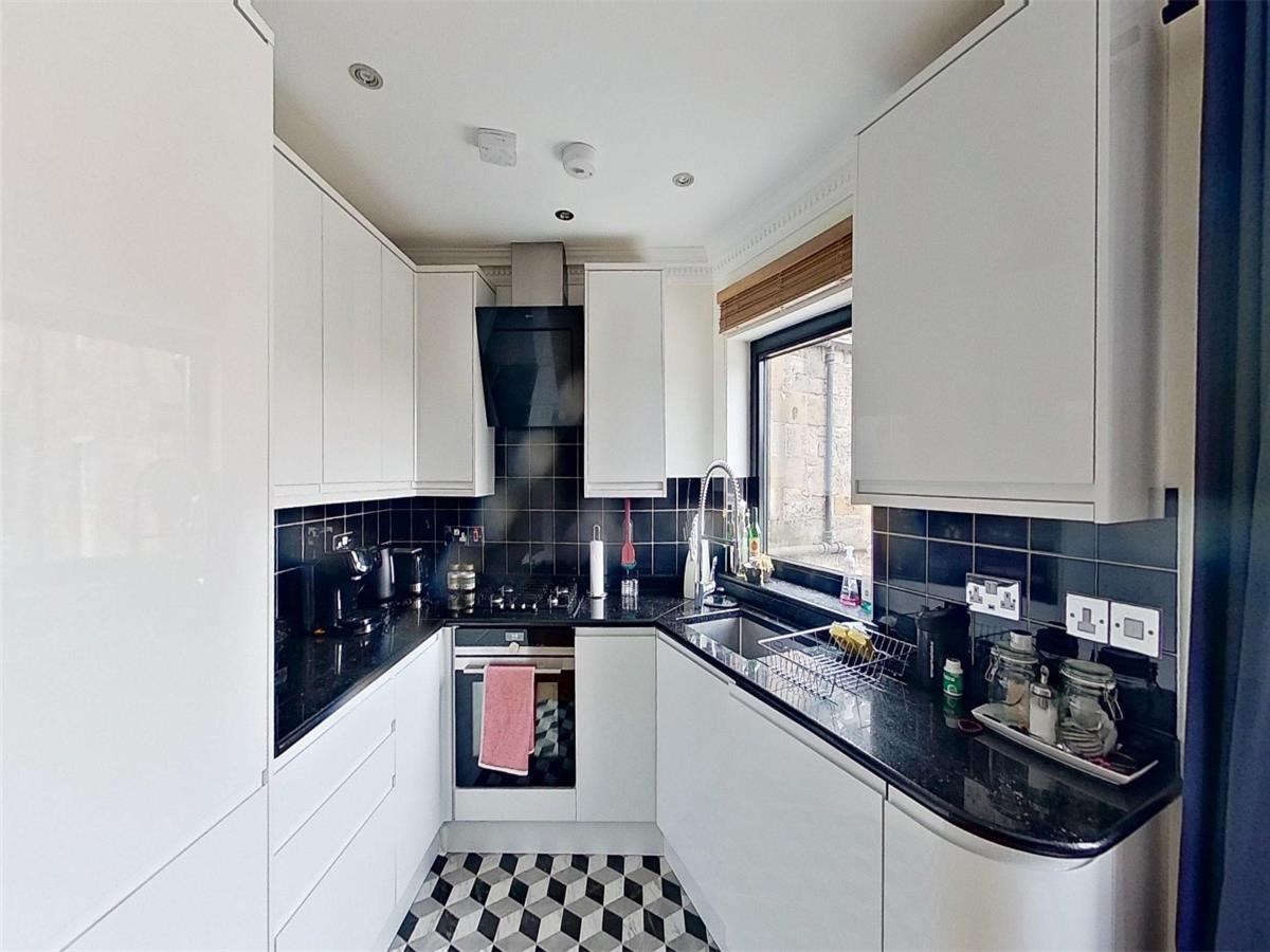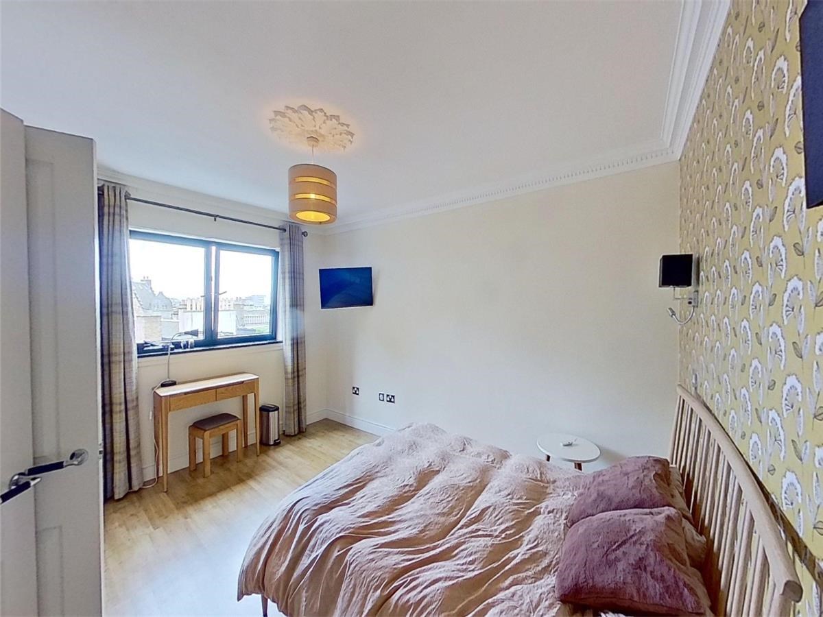 The well-proportioned kitchen/dining area is located on the first floor of the flat. There are also a host of modern-day appliances including integrated fridge/freezer, dishwasher and washing machine. two windows provide an abundance of natural light. The large ensuite bedroom can be found on the upper level. each and is filled with light through the framed view of the Edinburgh skyline.