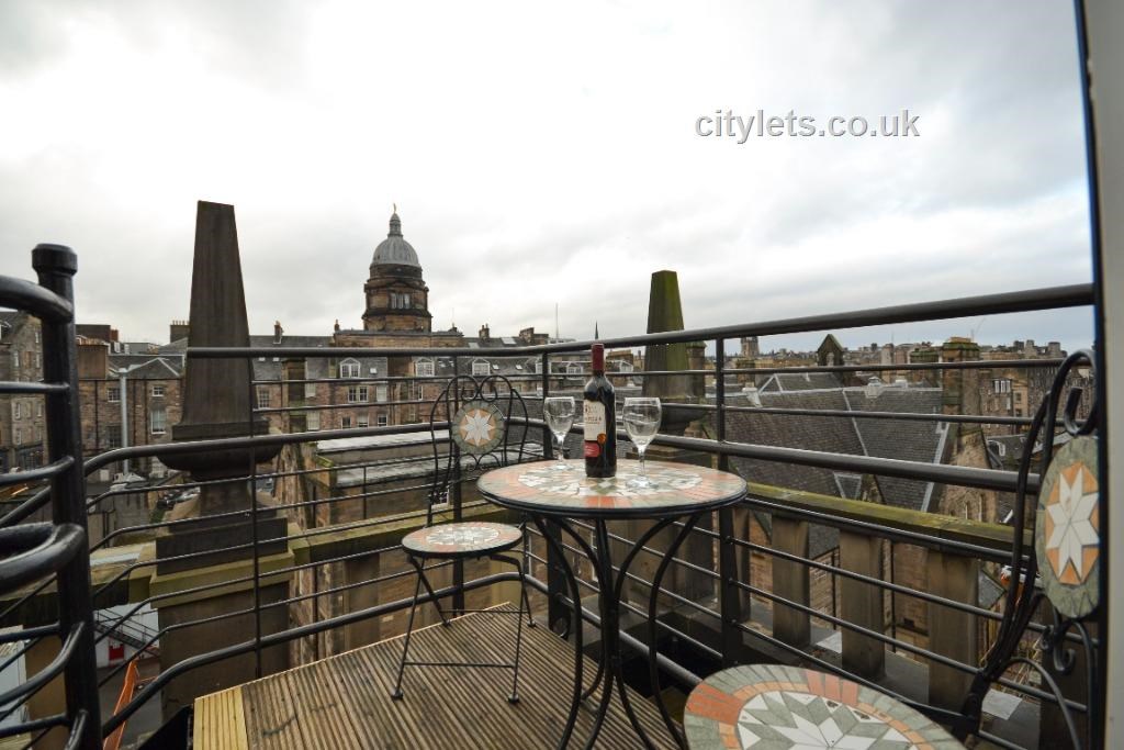 The property comprises hallway, sitting room with dining area, kitchen, master bedroom with en-suite, second double bedroom, shower room, and large rooftop balcony with views across Edinburgh's rooftops.