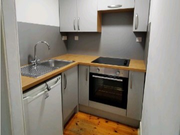 The flat includes an entrance hall that leads to a double bedroom on one side and a lounge, kitchen, and bathroom on the other. The lounge is equipped with an electric panel heater, sofa, and table. A compact kitchen off the lounge is fitted with an electric oven, hob, extractor hood, and larder fridge. The hallway leads to a storage cupboard housing the washing machine, hot tank, and bathroom, which includes a bath and over-bath electric shower. The double bedroom comes with a double bed, fitted wardrobes, and an electric panel heater. The property is neutrally decorated and features a combination of sanded floorboards and carpets. Traditional sash and case windows allow ample light into the lounge and bedroom. Available furnished