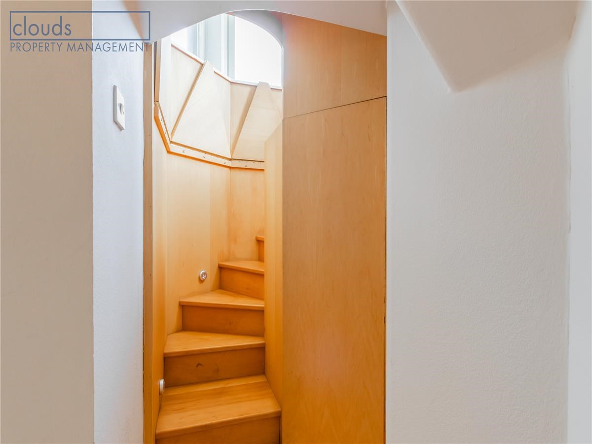 A bright and generous sized master bedroom with corner fitted wardrobes. Large living room with high ceilings, dining area and stairs to small turret seating.