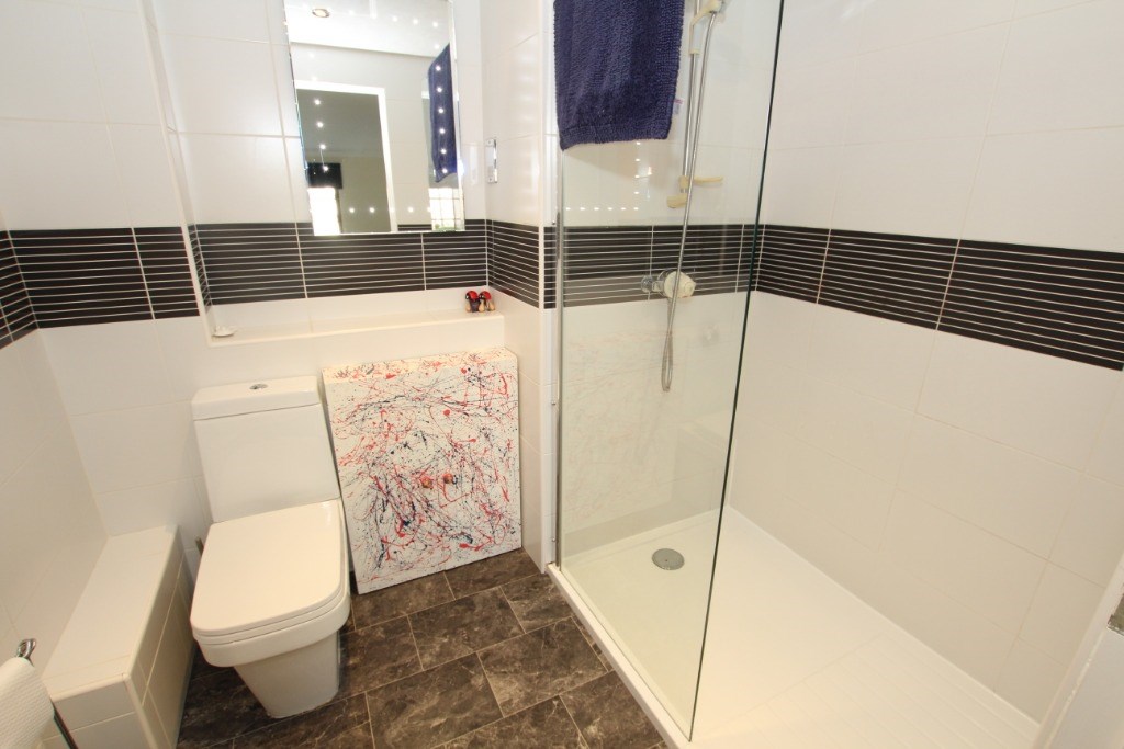 The property offers a welcoming entrance hallway that opens into a bright dining area and a generously sized living room, creating an ideal space for both relaxing and entertaining. The modern, fully equipped kitchen features high-quality integrated appliances. Accommodation includes two spacious double bedrooms, each with built-in wardrobes and contemporary en-suite shower rooms, as well as a versatile single bedroom with useful shelving. A stylish main bathroom completes the interior.