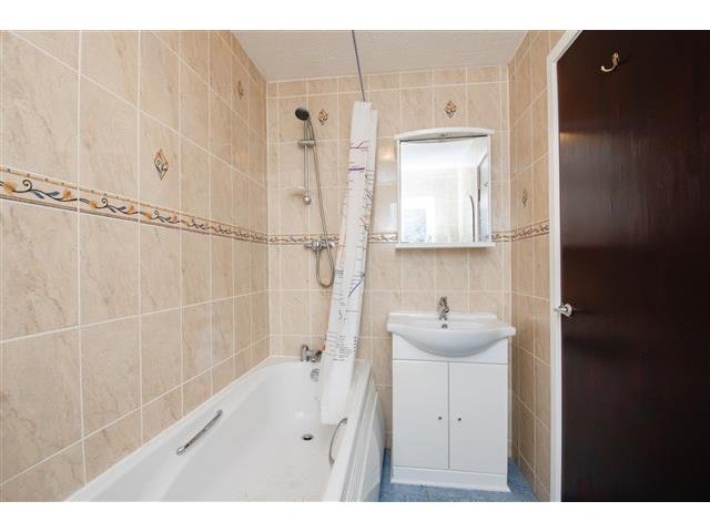 Upstairs, the landing leads to two generous double bedrooms. One benefits from built-in mirrored wardrobes and an additional storage cupboard, while the other features oak-effect laminate flooring and a wall-mounted bookcase. The fully tiled bathroom comprises a WC, vanity wash hand basin and a bath with over-bath shower, complemented by ceramic tiled flooring, a mirrored medicine cabinet and a chrome heated towel rail.