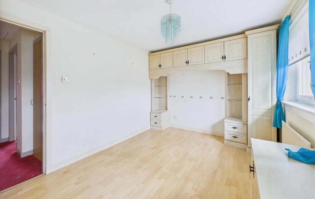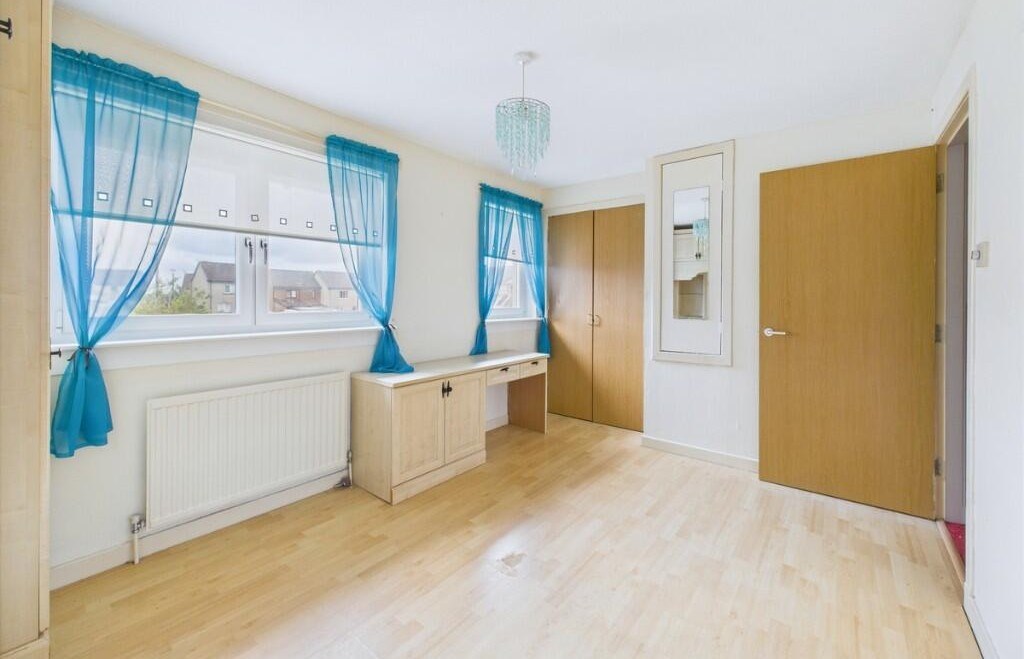 The upper level offers two well-proportioned bedrooms, both benefiting from built-in storage, along with a modern family bathroom fitted with a white suite and over-bath electric shower.