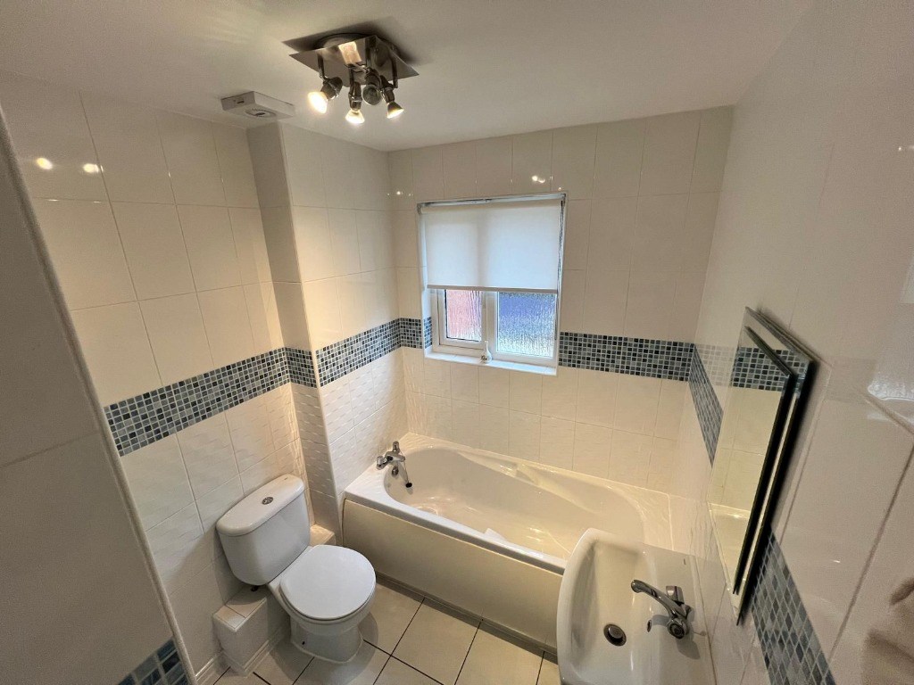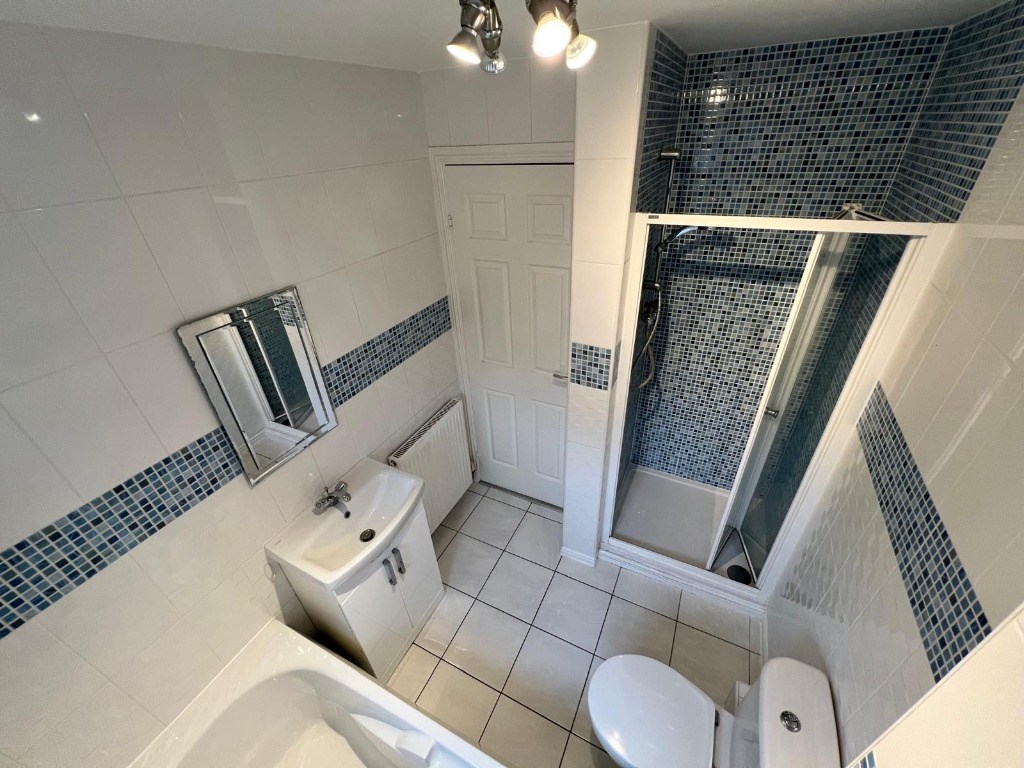 The contemporary fitted kitchen offers ample storage and workspace, while the sleek family bathroom includes a separate walk-in shower for added convenience. In addition, there is a second bathroom located on the ground floor.