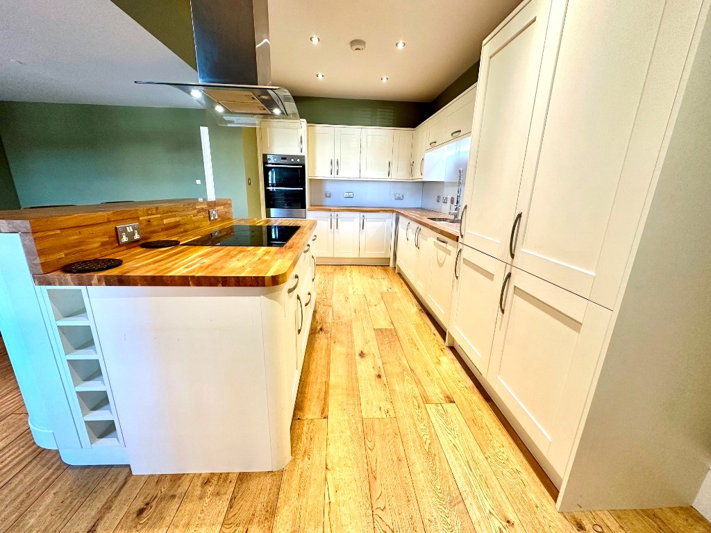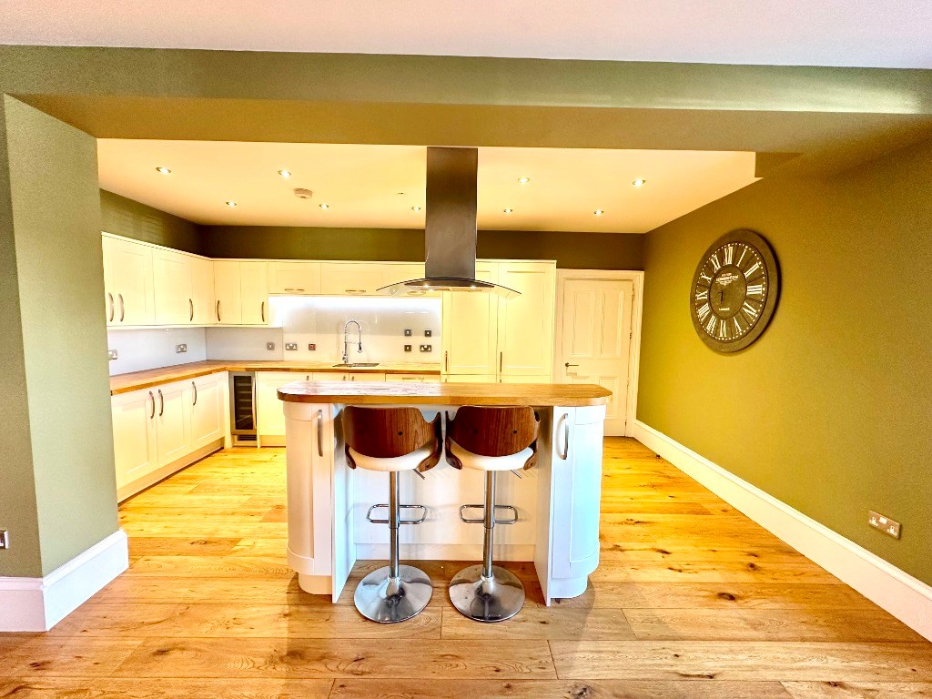 The incredibly versatile and spacious open plan lounge area offers ample room for furniture and a dining area leaving plenty of extra living space. The kitchen is separated by an island, which gives the property a greater social aspect, hosts a range of floor and wall mounted modern fitted units and a selection of fitted appliances including electric oven/grill, five ring induction hob, dishwasher, fridge/freezer and a wine fridge. The kitchen further benefits from a separate utility room offering wall mounted shelving for storage and houses the washing machine.