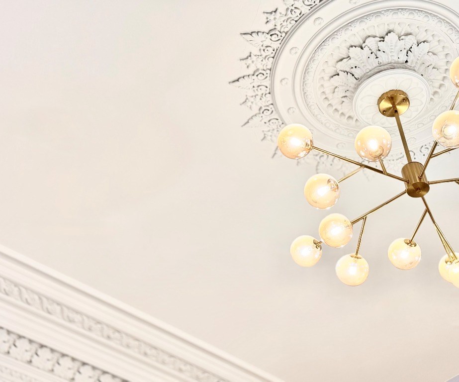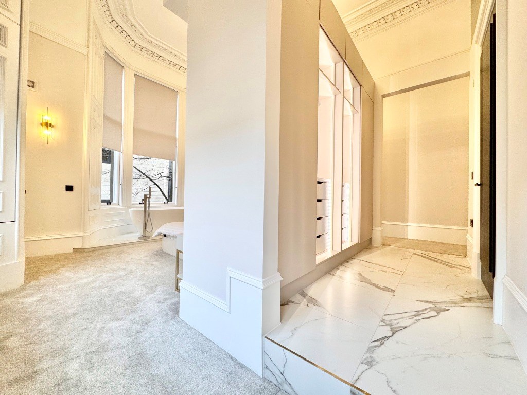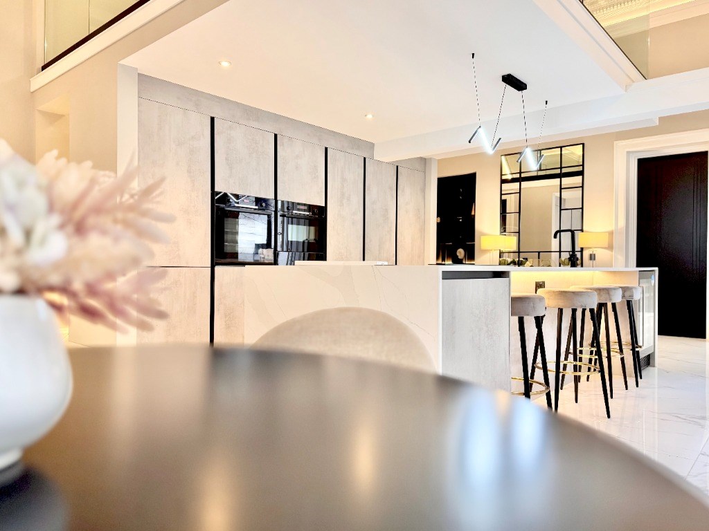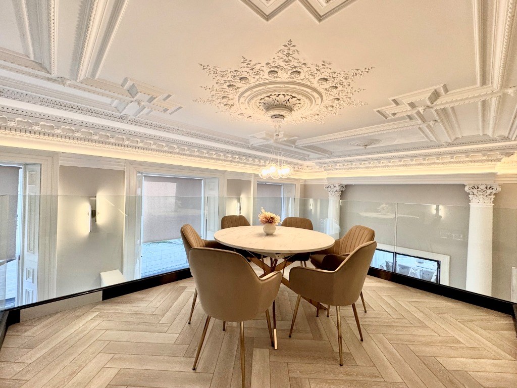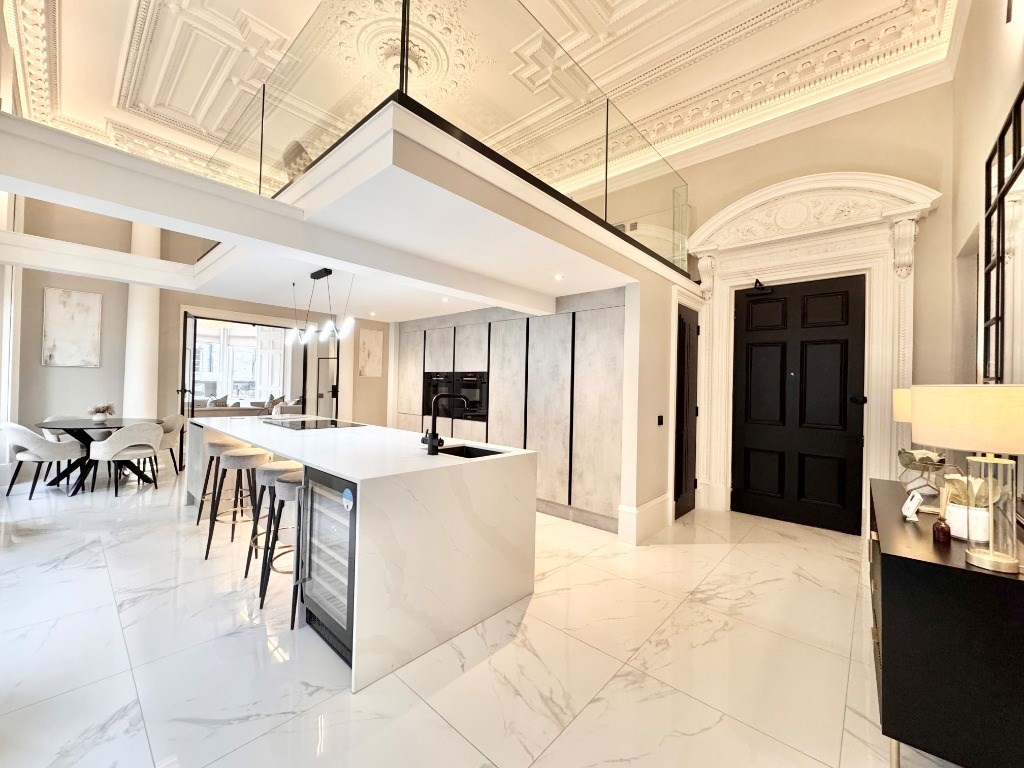 The kitchen is fully fitted with integrated appliances and boasts a large centre island with breakfasting bar. The dining kitchen also boasts beautiful Corinthian columns and an incredible ceiling with ornate cornicing.