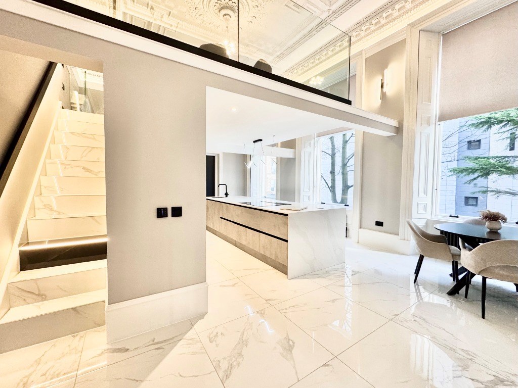 One of the features of the refurbishment is the clever addition of a mezzanine level dining space above the kitchen, access via a tiled staircase and enclosed with frameless glass balustrades.