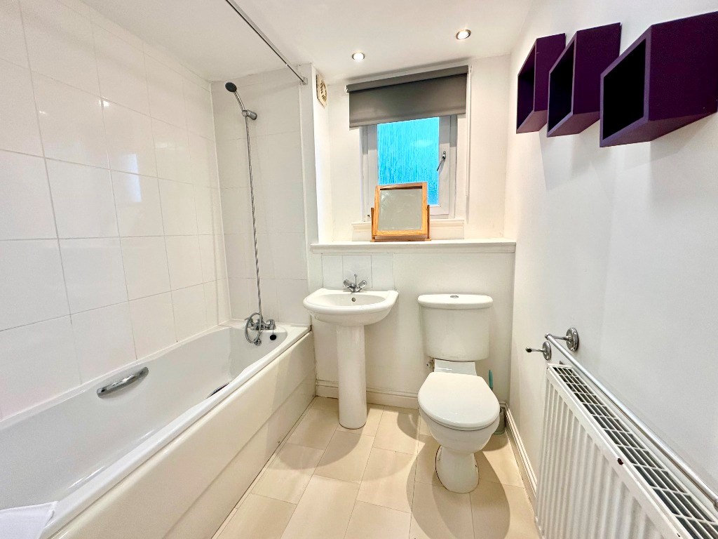 Finally, the partly-tiled family bathroom features a three piece white bathroom suite consisting of a sink, toilet, and bath with shower attachment overhead via the tap attachment.