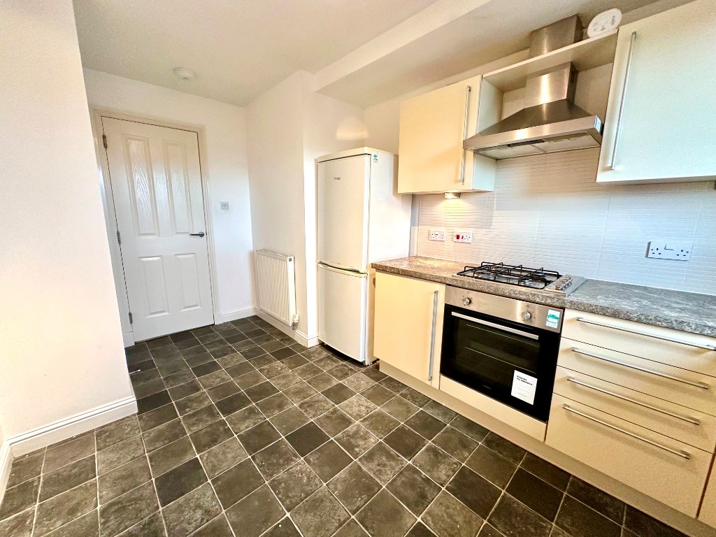 The lounge has ample living space and the large windows allow lots of natural light to fill the room. The spacious kitchen hosts a range of floor and wall mounted fitted units with a selection of appliances including fridge/freezer, four-ring gas hob, oven, washing machine and space for a small dining table.