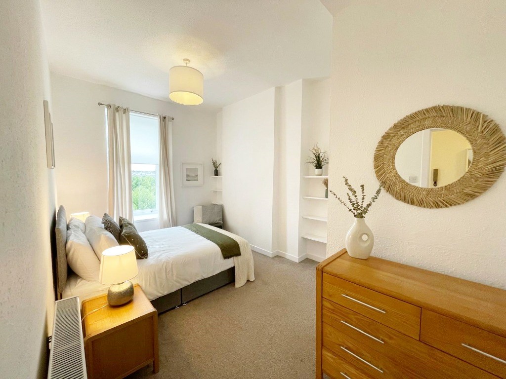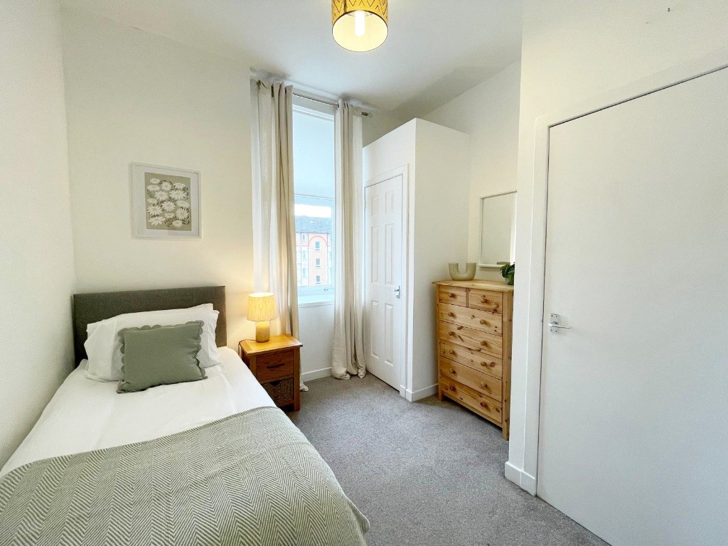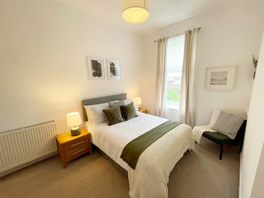 The flat feels spacious and provides a large double bedroom with fitted wardrobe, and a single room to rear with built-in storage. There is a family bathroom, with bath and electric shower and a large hall cupboard for storage.