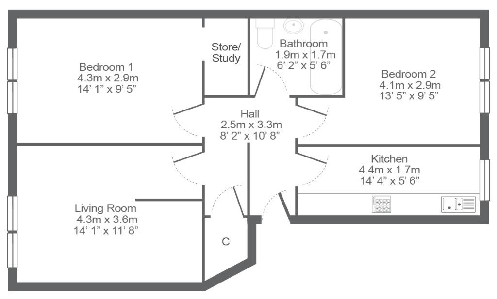 The accommodation has recently been fully redecorated and opens into a welcoming reception hallway which gives access to all rooms and has a large storage cupboard off. The modern internal bathroom has white ceramics and an electric shower over the bath, the galley style kitchen comes complete with all necessary appliances including under counter fridge, under counter freezer, electric oven and washing machine. The living room has space for a dining table and both double bedrooms are doubles in size, one of which has a storage area to the rear which could also be used as a study.