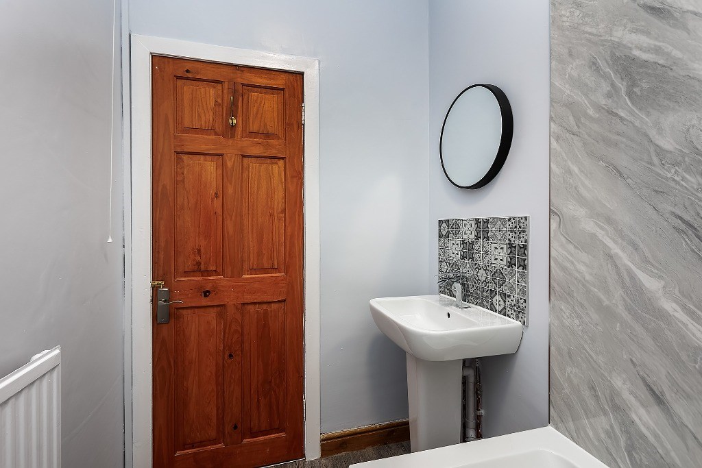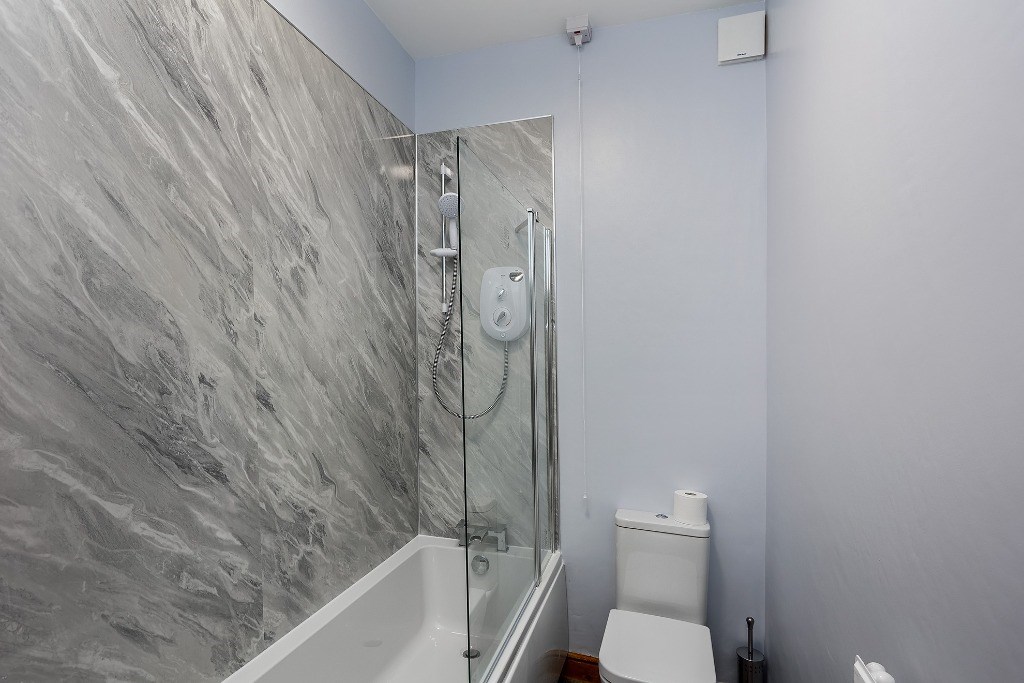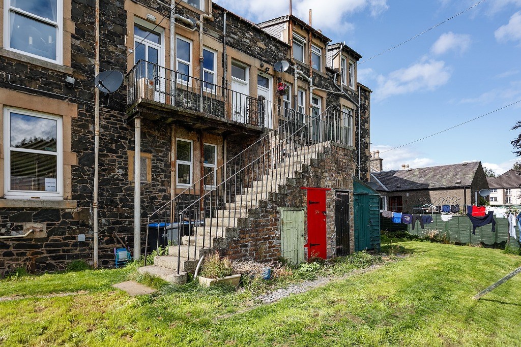 The property is accessed via the rear of the building, with outdoor steps leading to a terrace and main entrance door. The flat comprises of a newly fitted, modern kitchen with electric hob and built under oven, washing machine and fridge/freezer, with ample wall units, a spacious lounge with feature fireplace and electric fire and two large windows allowing plenty of light in, a spacious master bedroom with decorative feature fireplace, and second bedroom benefits from views across to the Cuddy and comes with a storage cupboard, and a newly fitted contemporary bathroom with shower over bath.