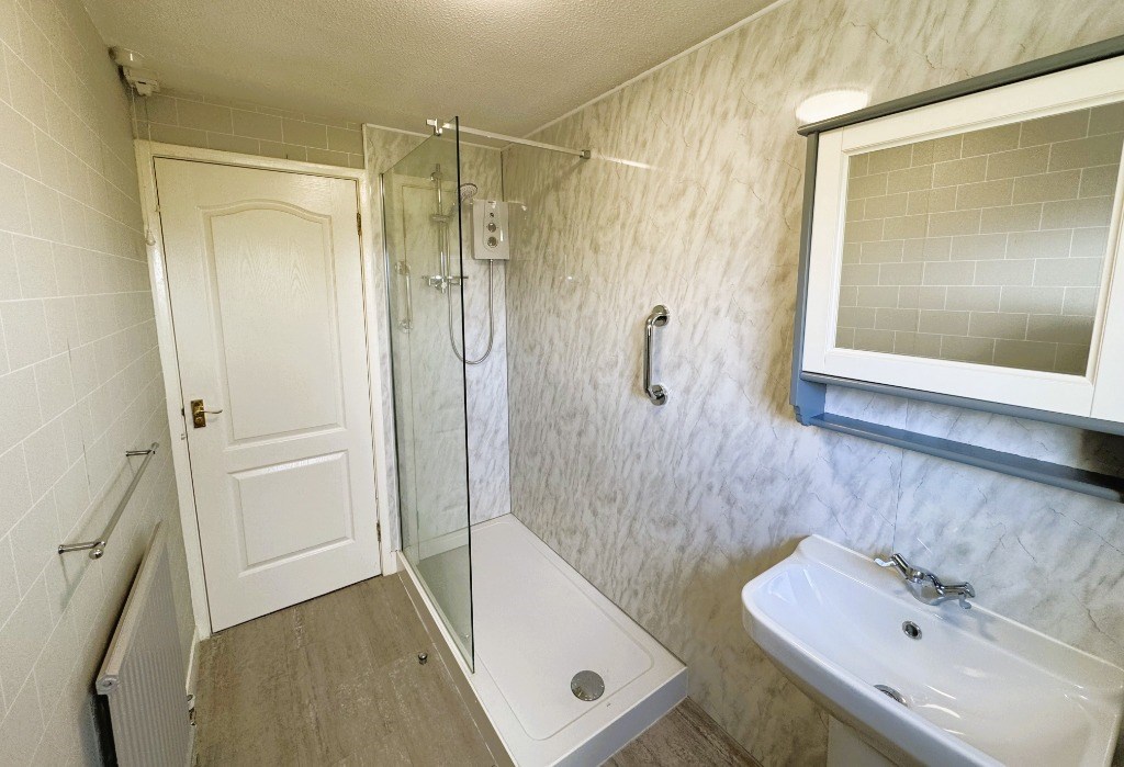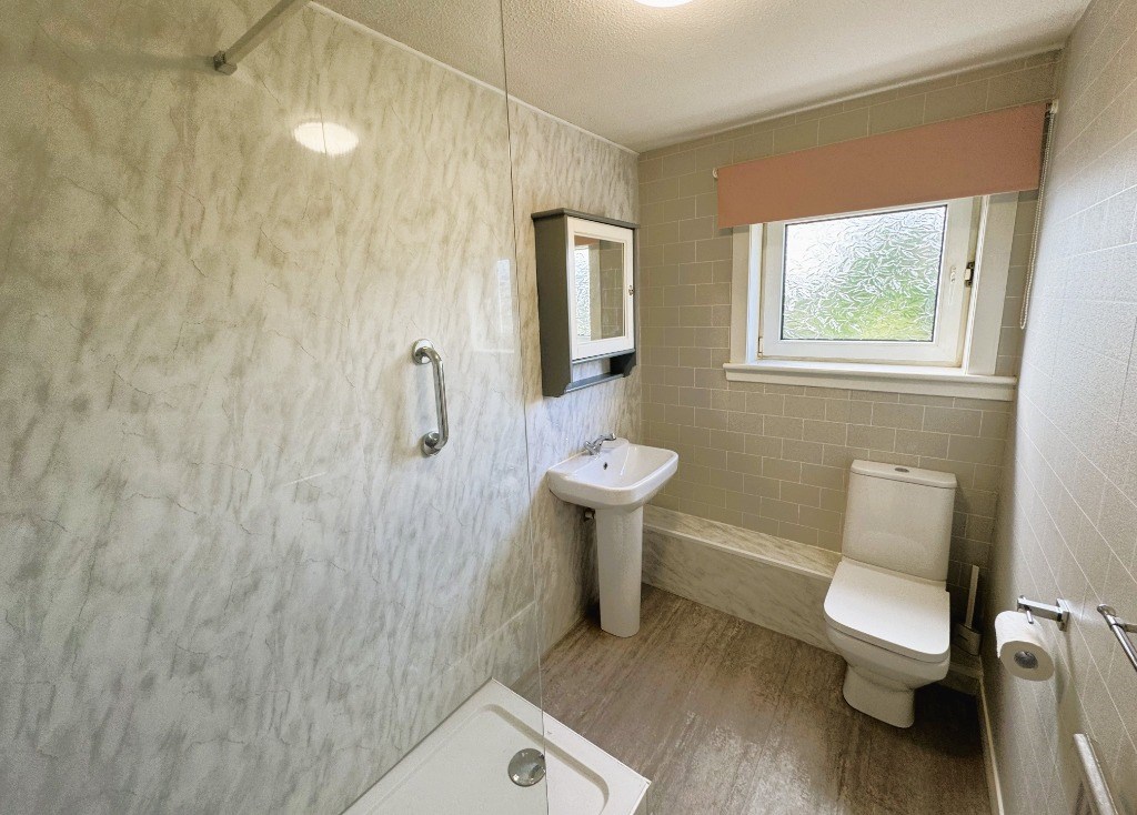 • A recently renovated bathroom featuring a modern suite with WC, sink, and a large walk-in shower.