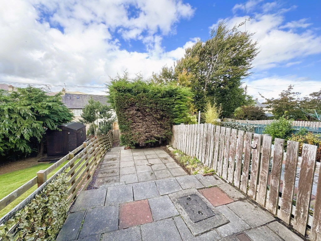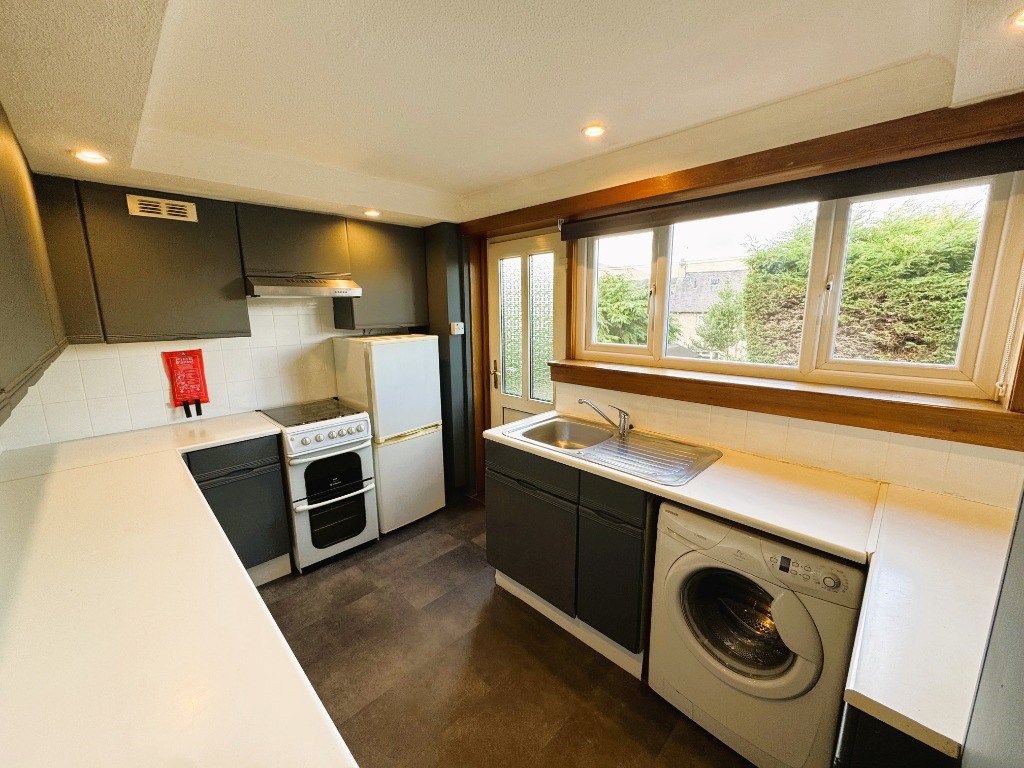 • A fitted kitchen complete with standalone gas cooker, fridge freezer, and under-counter washing machine. With door leading to the low-maintenance, paved rear garden with a storage hut.